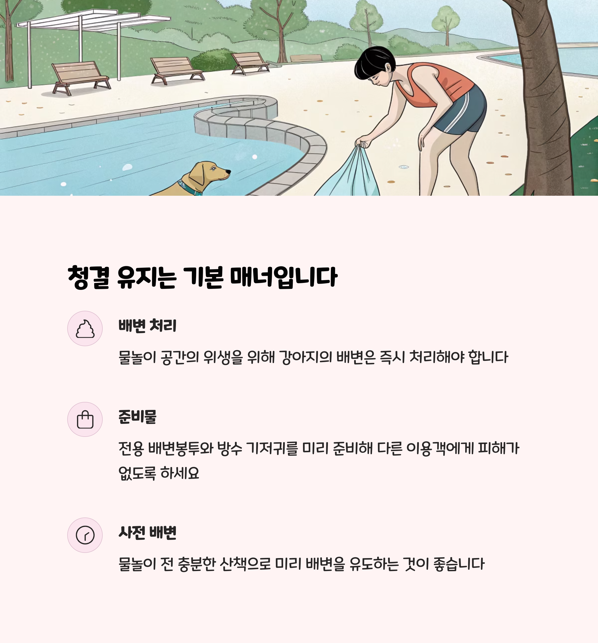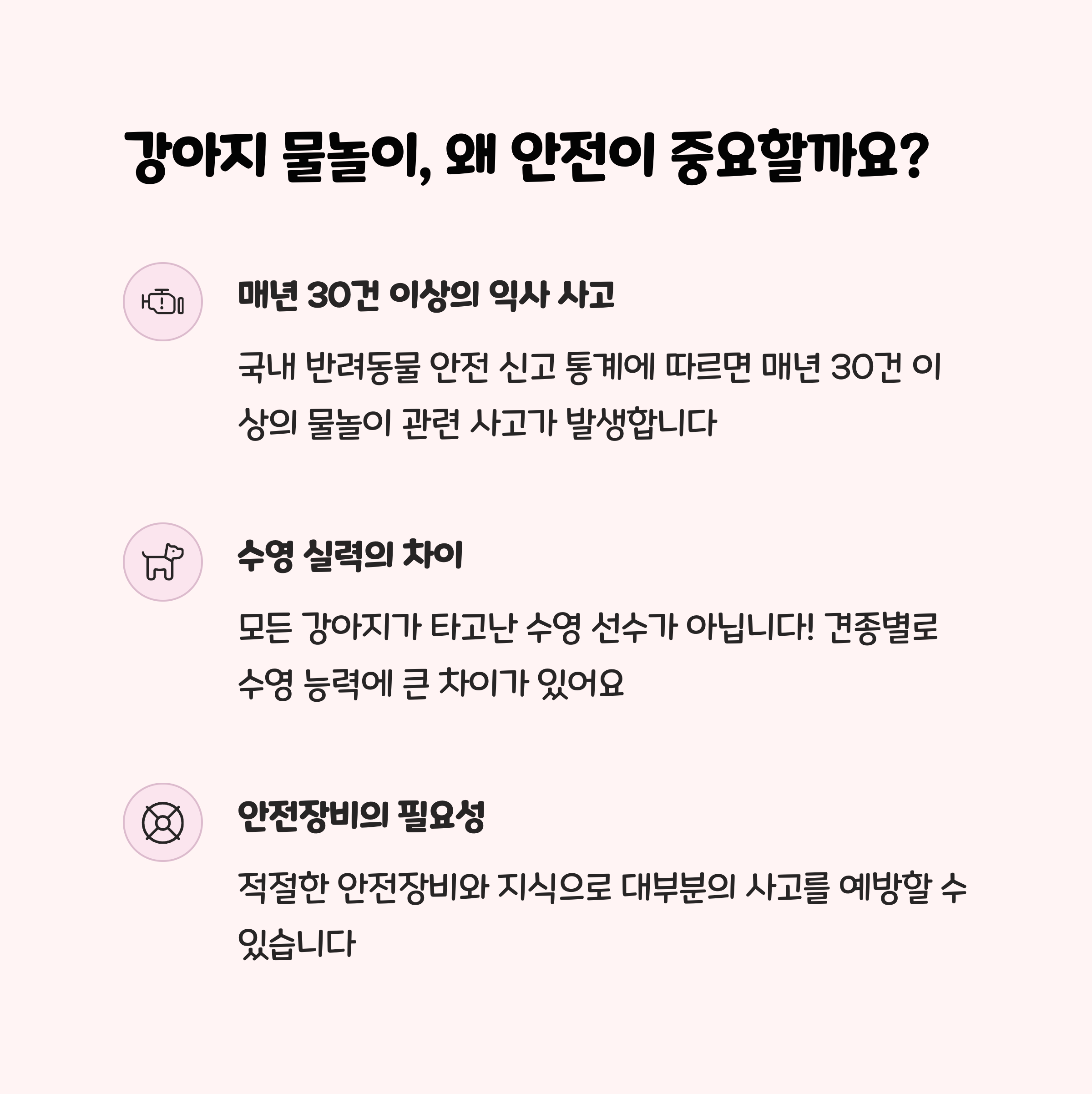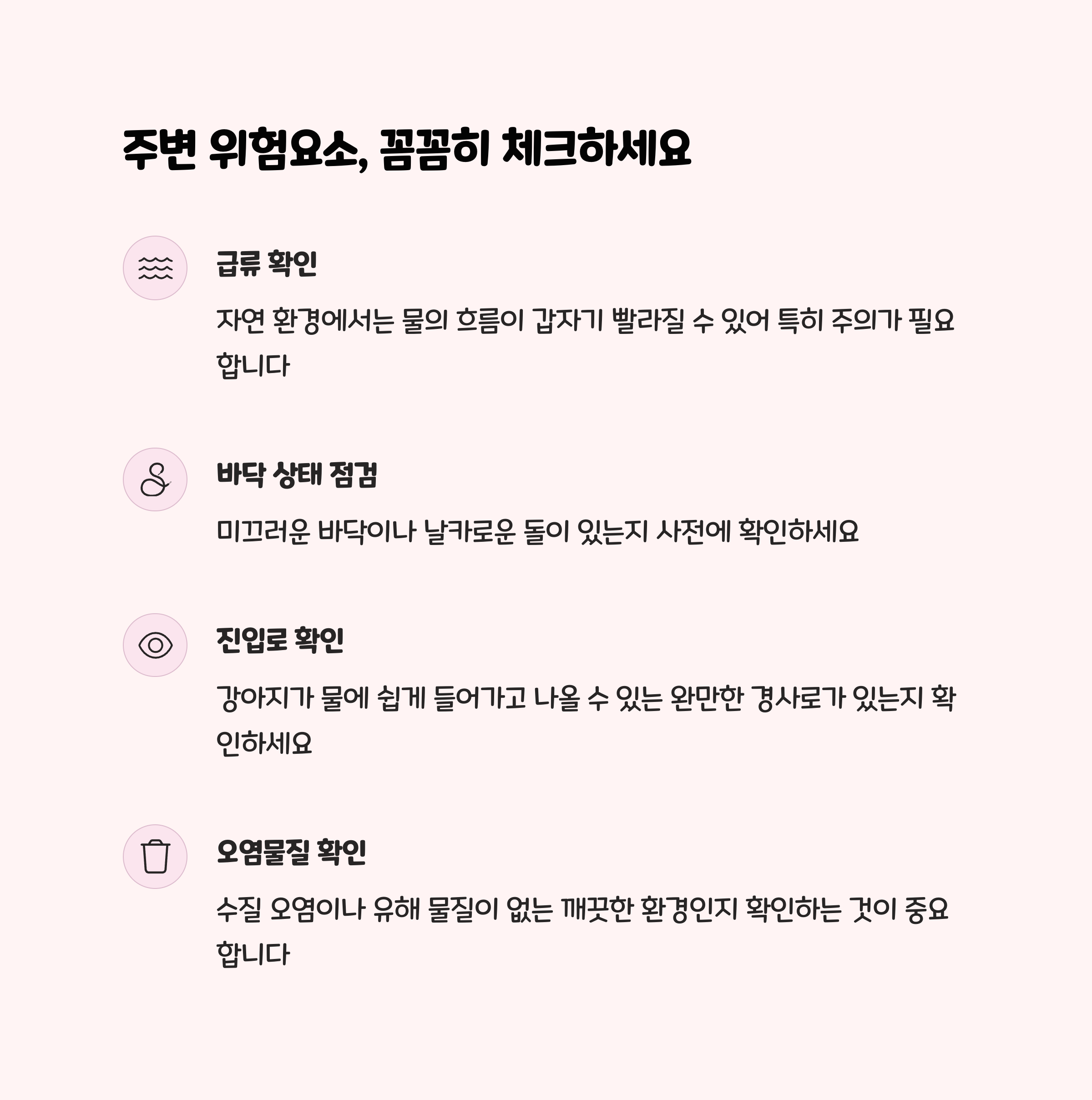 • 강아지가 물살에 휩쓸리거나 미끄러질 수 있으니, 항상 보호자가 곁에서 지켜봐야 합니다.