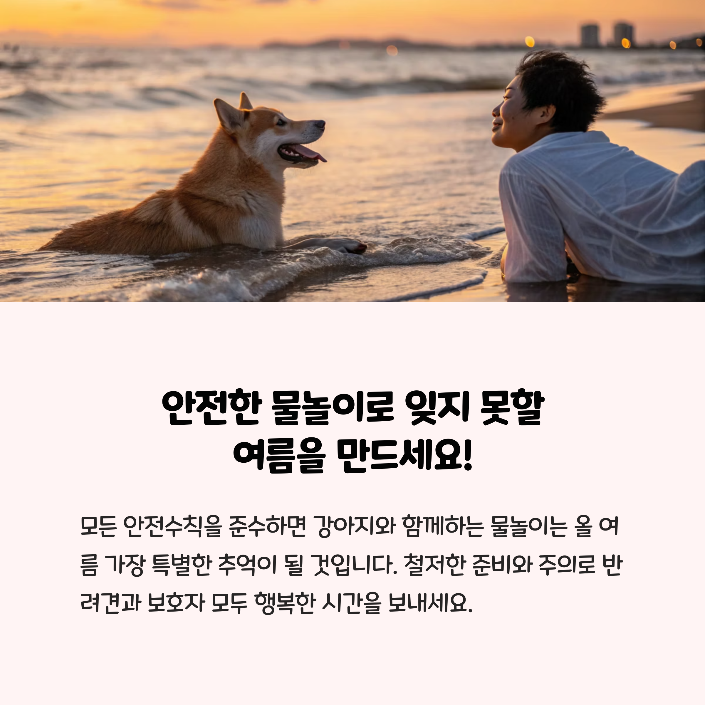 강아지와의 여름 물놀이는 준비와 안전수칙만 잘 지키면, 반려견에게도 보호자에게도 잊지 못할 추억이 됩니다. 구명조끼, 튜브 등 필수템을 꼼꼼히 챙기고, 장소와 시간, 강아지의 컨디션을 세심하게 살피는 것이 무엇보다 중요합니다. 올여름, 반려견과 함께 시원하고 안전한 물놀이로 특별한 하루를 만들어보세요!
