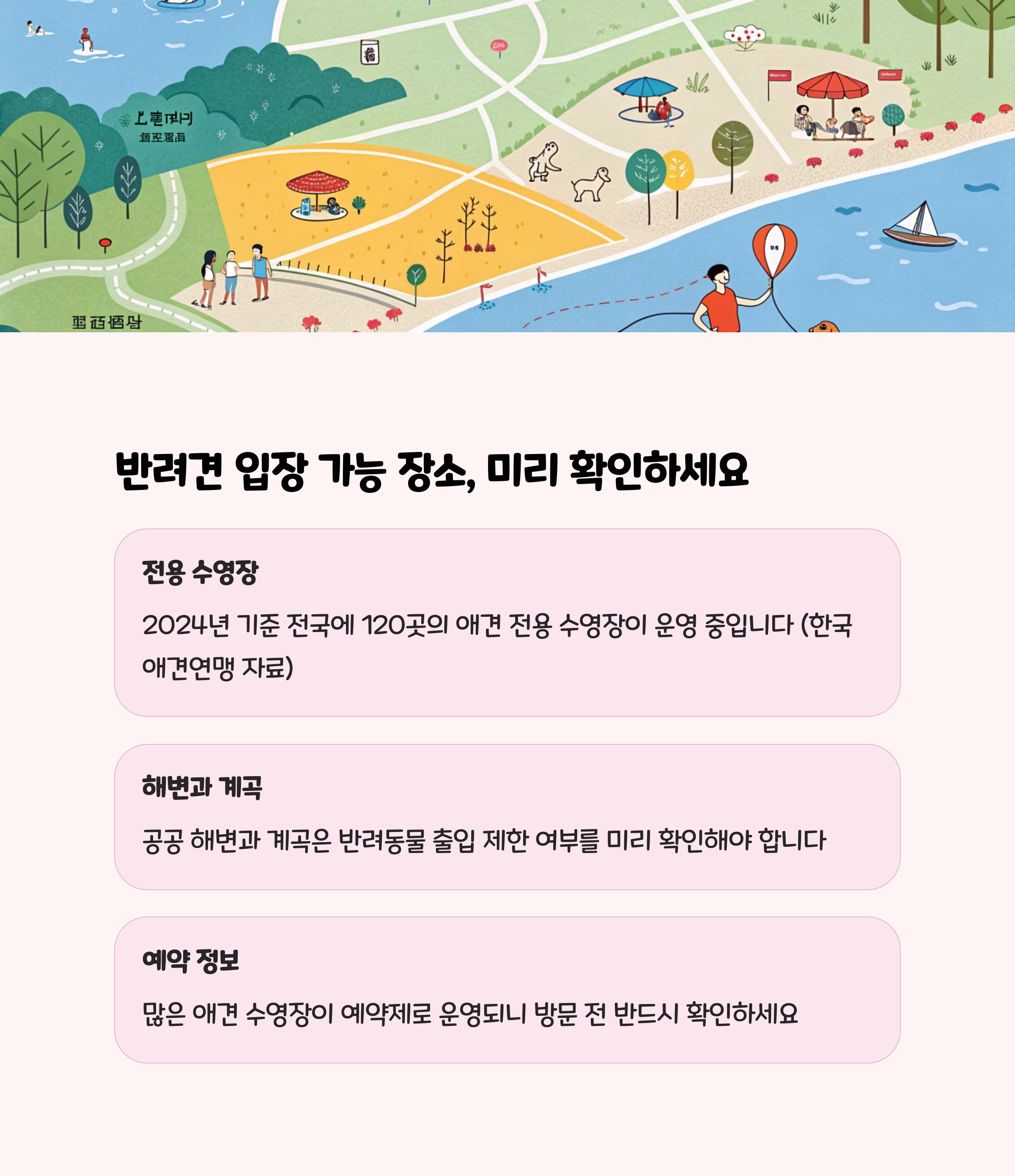 • 일부 해수욕장, 계곡, 공원은 반려동물 출입이 제한될 수 있으니, 사전에 확인해야 불필요한 낭패를 막을 수 있습니다.