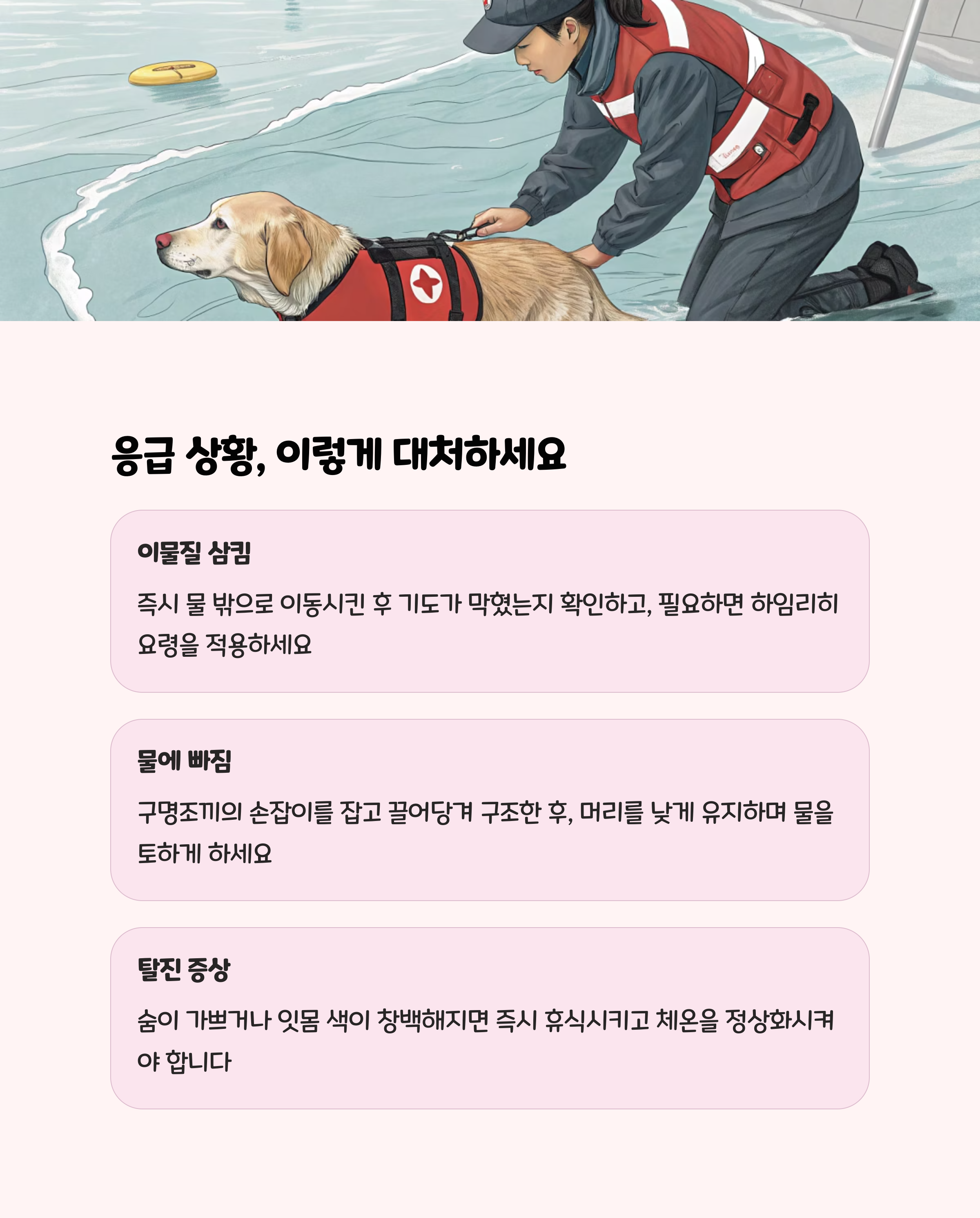 • 물놀이 후 기침, 호흡곤란, 구토, 설사 등 이상 증상이 나타나면 ‘마른 익사’ 등 위험한 상황일 수 있으니 즉시 동물병원 진료를 받으세요.