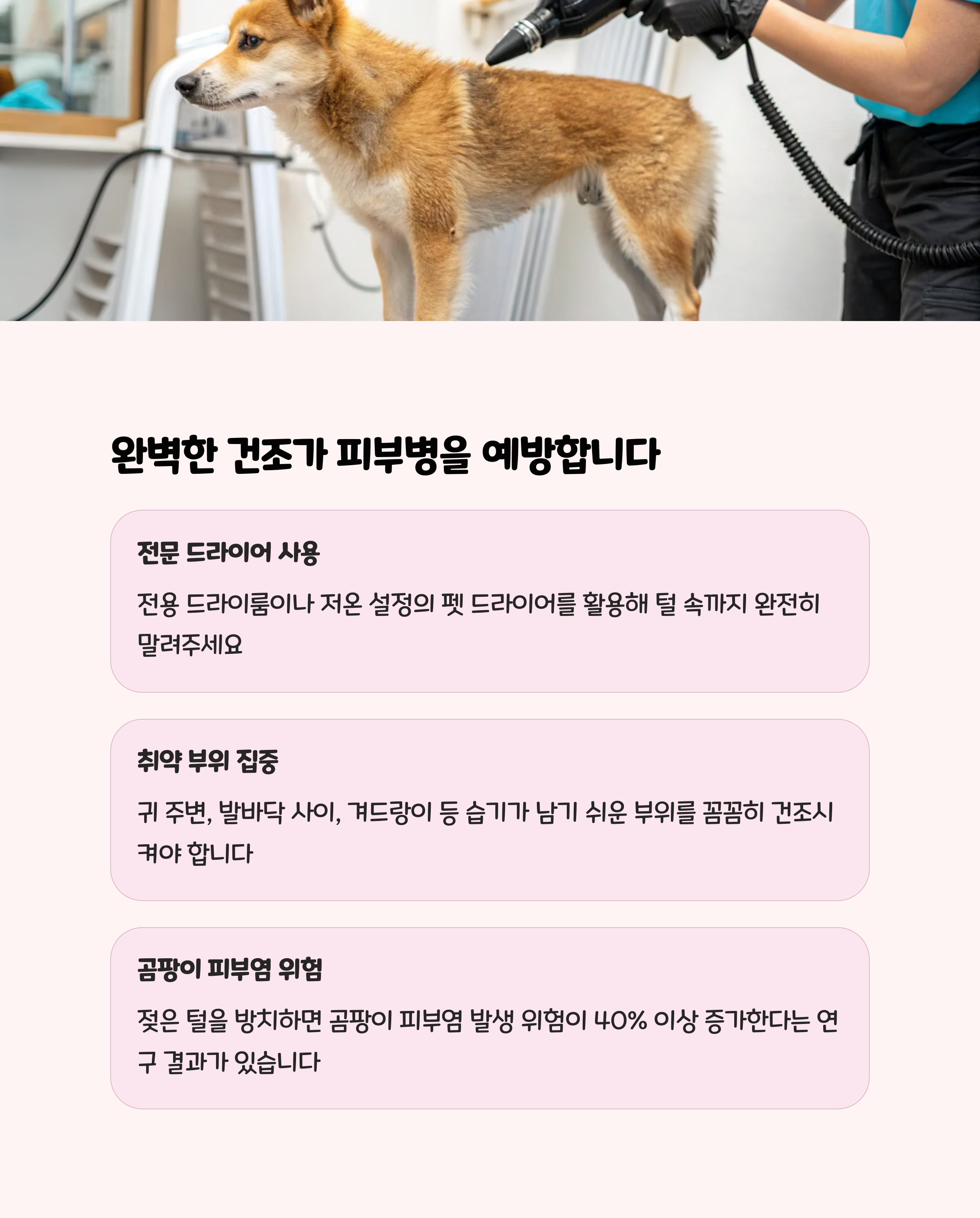 • 젖은 털을 방치하면 세균, 곰팡이 감염 위험이 높아집니다. 수건과 드라이기로 털과 피부, 귀 안쪽까지 완전히 말려주세요.