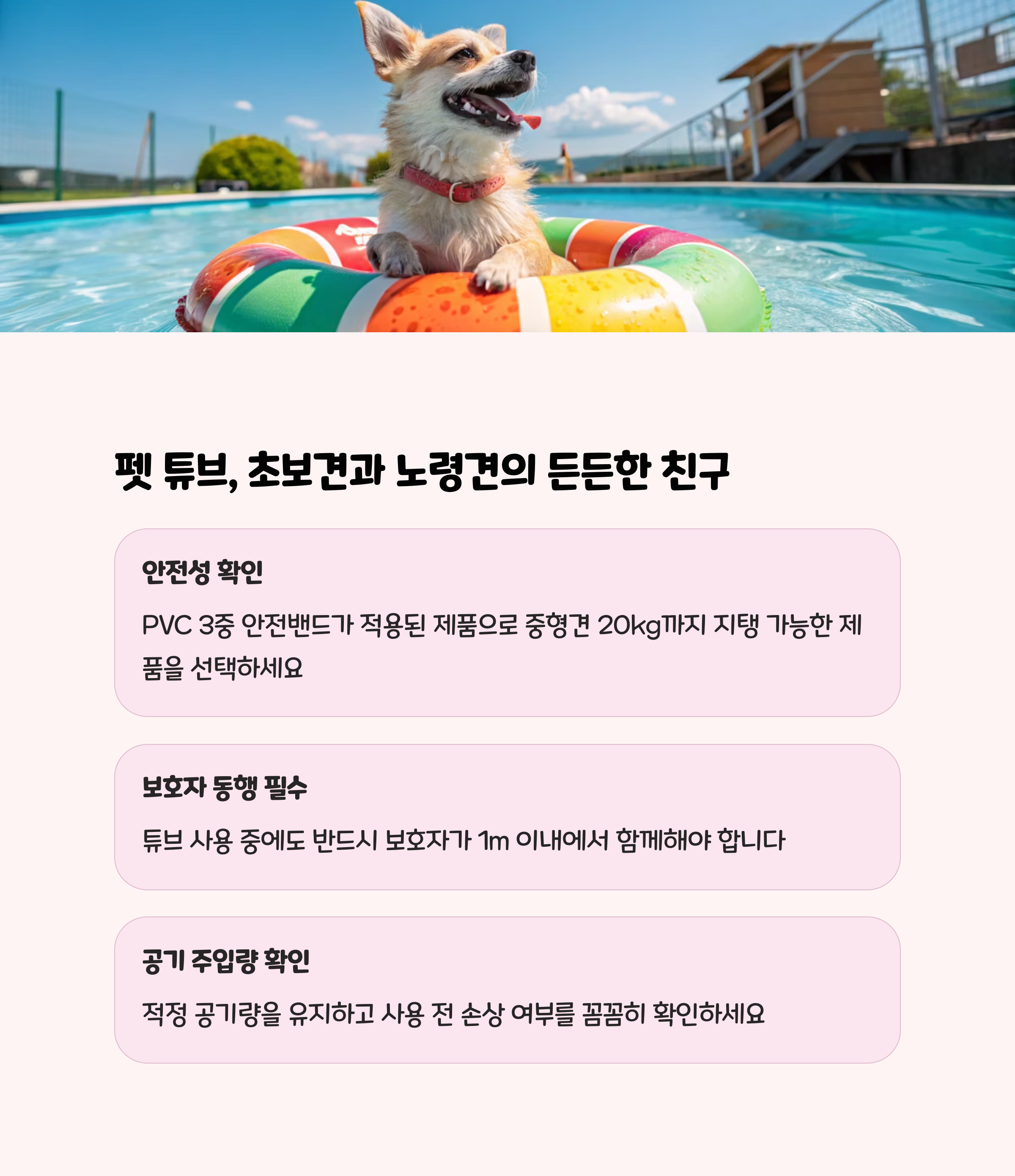 • 수영이 익숙하지 않거나 체력이 약한 강아지에게 튜브는 꼭 필요한 아이템입니다. 튜브 위에서 쉬거나 보호자와 함께 물 위를 떠다니며 안전하게 물놀이를 즐길 수 있습니다.
