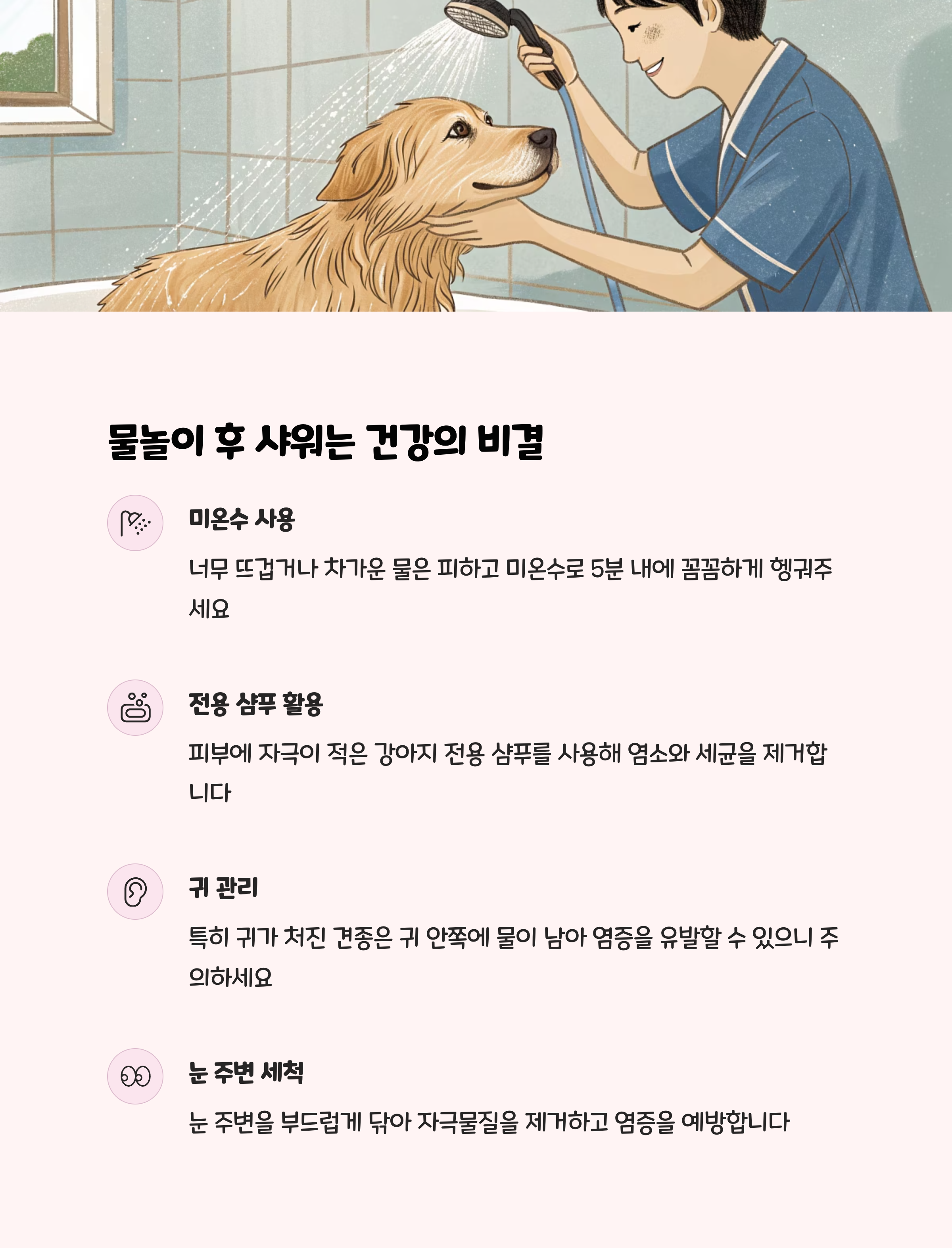 • 염분, 세균, 오염물질을 제거하기 위해 깨끗한 물로 꼼꼼히 씻기고, 강아지 샴푸를 사용해 피부와 털을 청결하게 관리합니다.