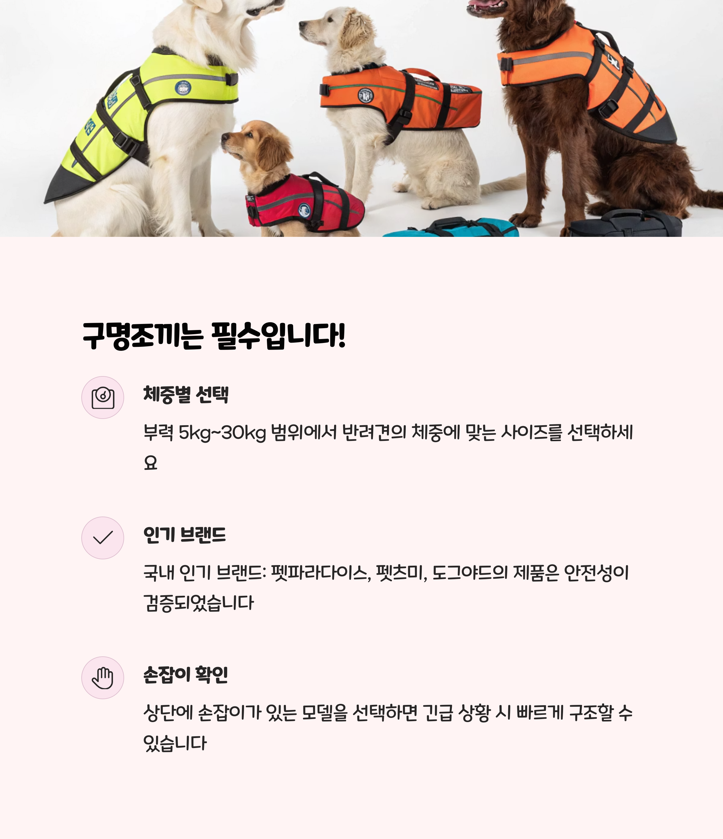 • 최근 인기 제품은 ‘도그아이 조이플 구명조끼’, ‘멍뭉스 세이프가드 구명조끼’ 등으로, 턱받이 디자인이 적용되어 얼굴 보호와 물 튐 방지에 효과적입니다.
