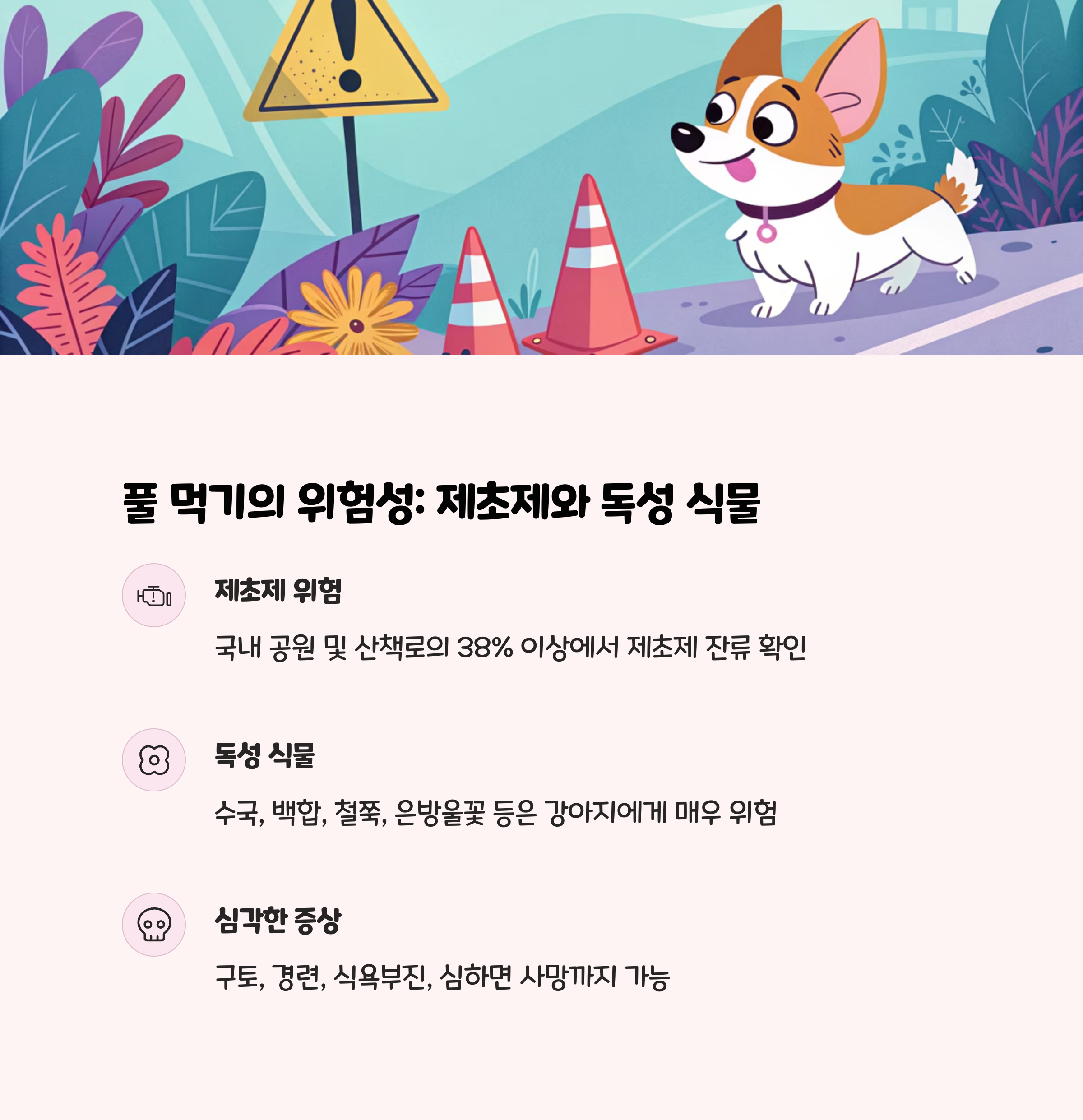 본 내용은 미국 캘리포니아 데이비스 대학 연구(반려견 80% 풀 섭취 행동)와 농촌진흥청 제초제 잔류 조사, 국내 동물병원 임상 경험을 종합해 작성되었습니다.