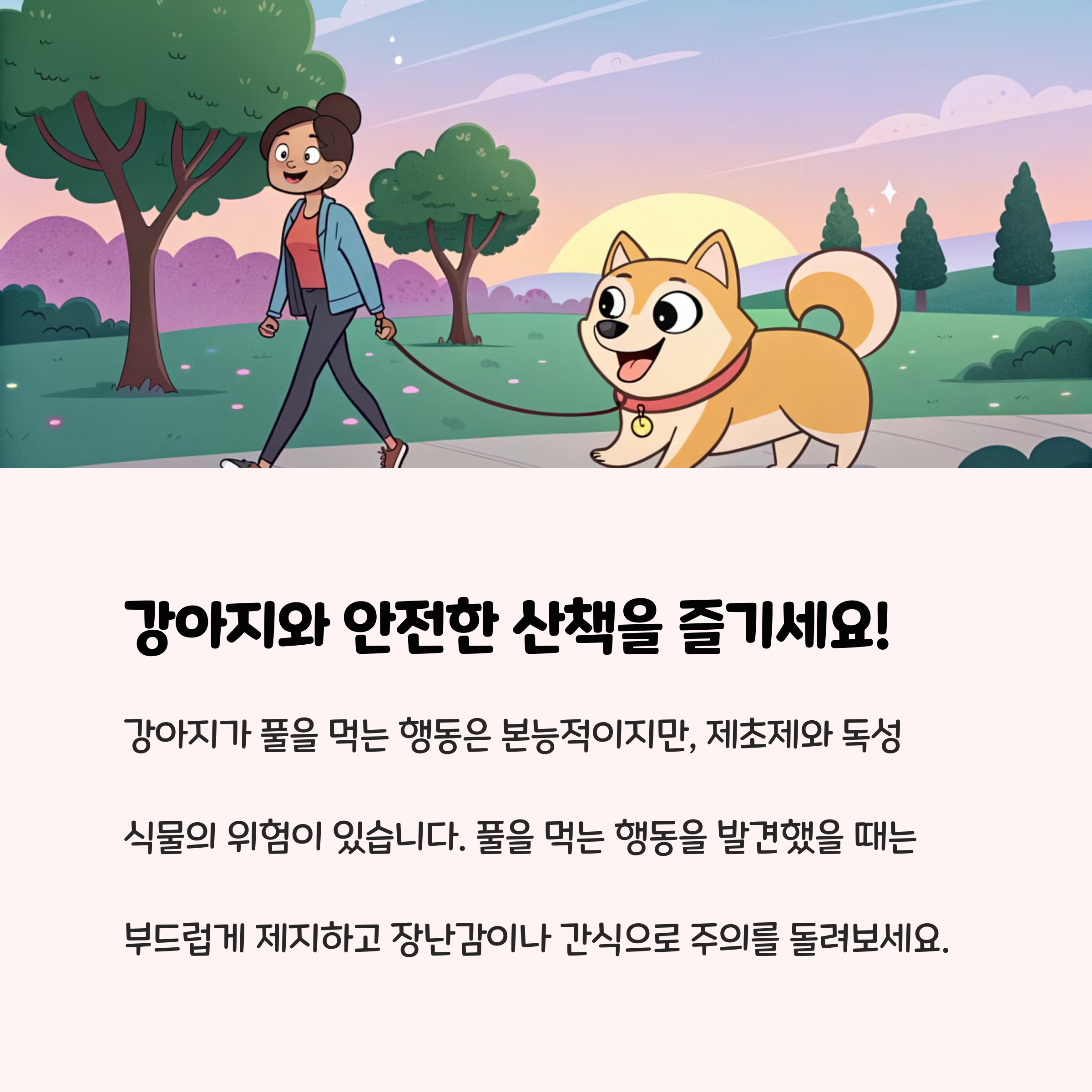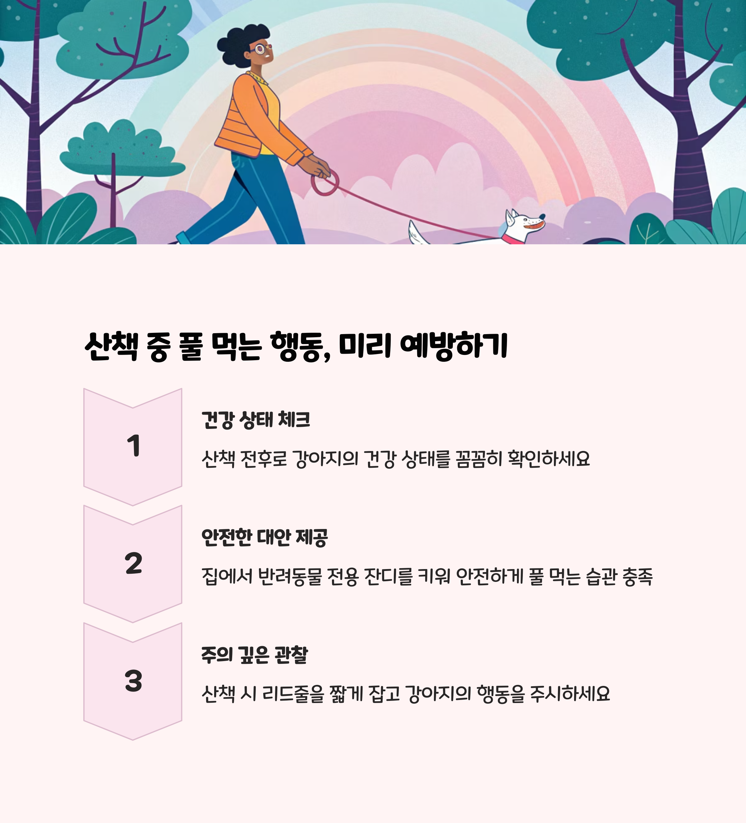 풀이나 위험한 식물이 많은 산책로는 가급적 피하고, 깨끗한 산책 코스를 선택하세요. 또한 산책 시간을 충분히 확보해 강아지가 스트레스를 풀고, 호기심을 해소할 수 있도록 해주는 것도 도움이 됩니다.
