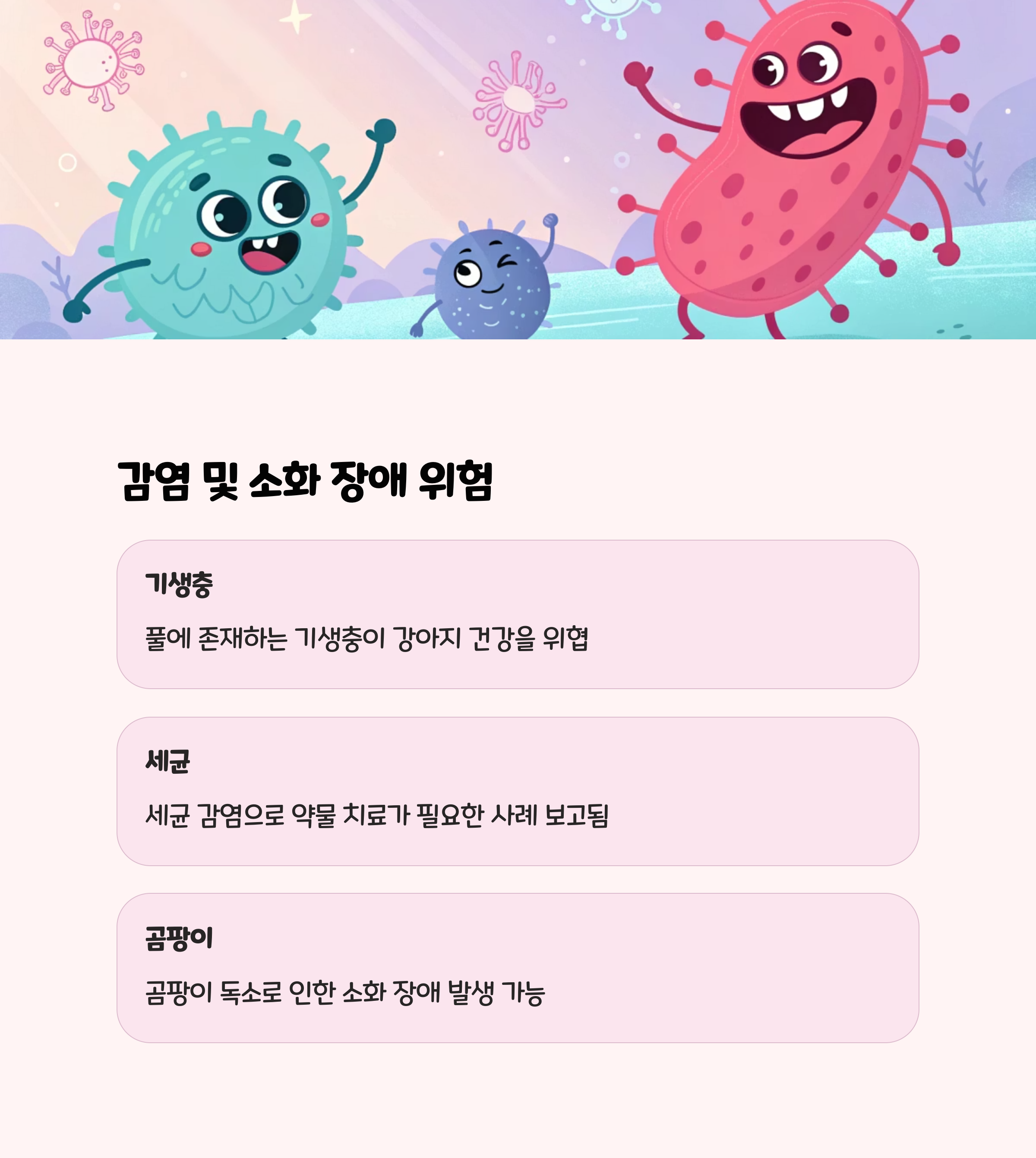 풀에는 기생충, 세균, 곰팡이 등이 존재할 수 있어, 강아지가 풀을 먹고 난 뒤 설사, 구토, 식욕 저하 등의 증상이 나타나는 경우가 있습니다. 실제로 보호자 경험담에 따르면 풀을 먹은 뒤 세균 감염으로 인해 약을 복용한 사례도 보고되고 있습니다.