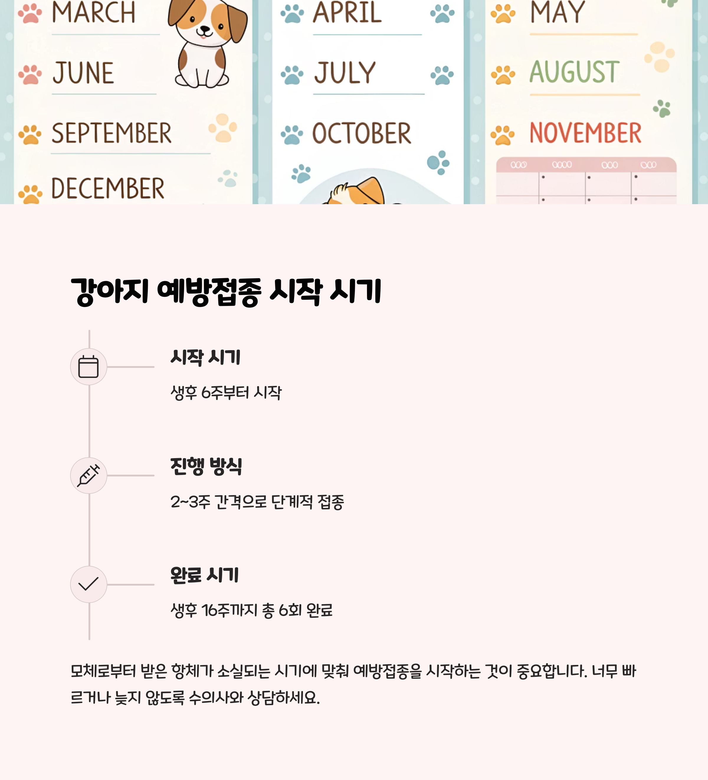- 6차 접종 (생후 16주) : 광견병 예방접종과 인플루엔자 백신 2차를 진행합니다.