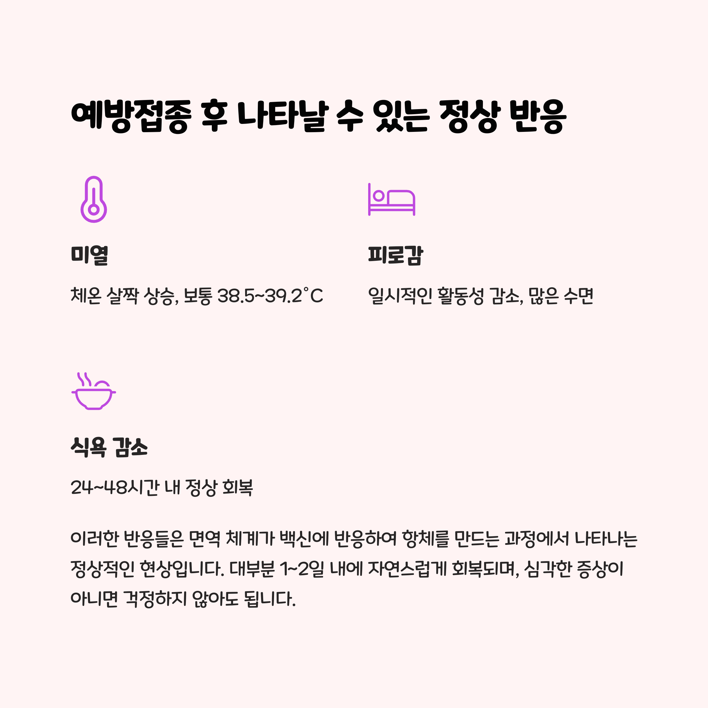 - 가벼운 발열이나 피로감은 일반적이며 하루 이내로 회복됩니다.