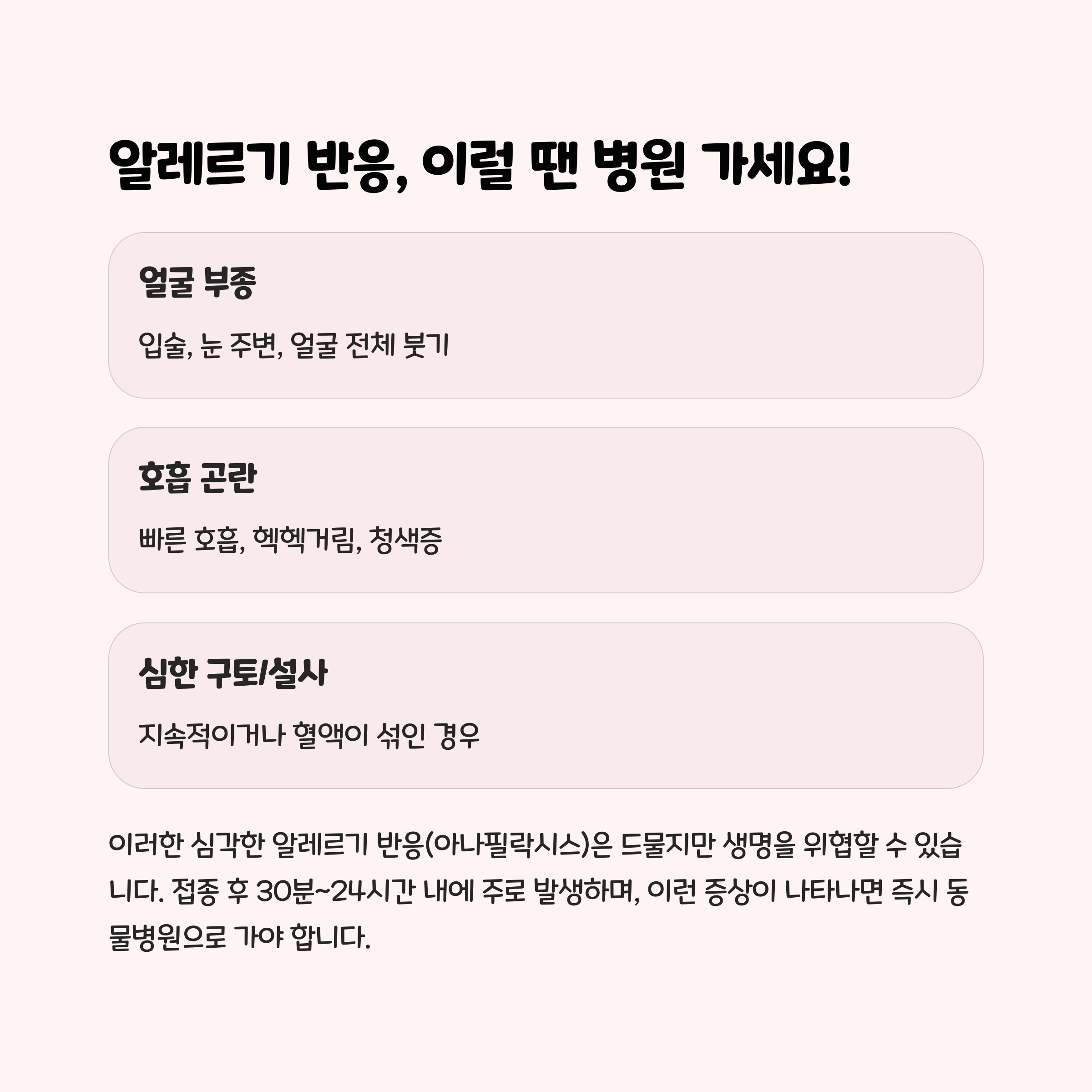 - 얼굴 부기, 구토, 설사 등의 알레르기 반응이 나타나면 즉시 동물병원에 방문해야 합니다.