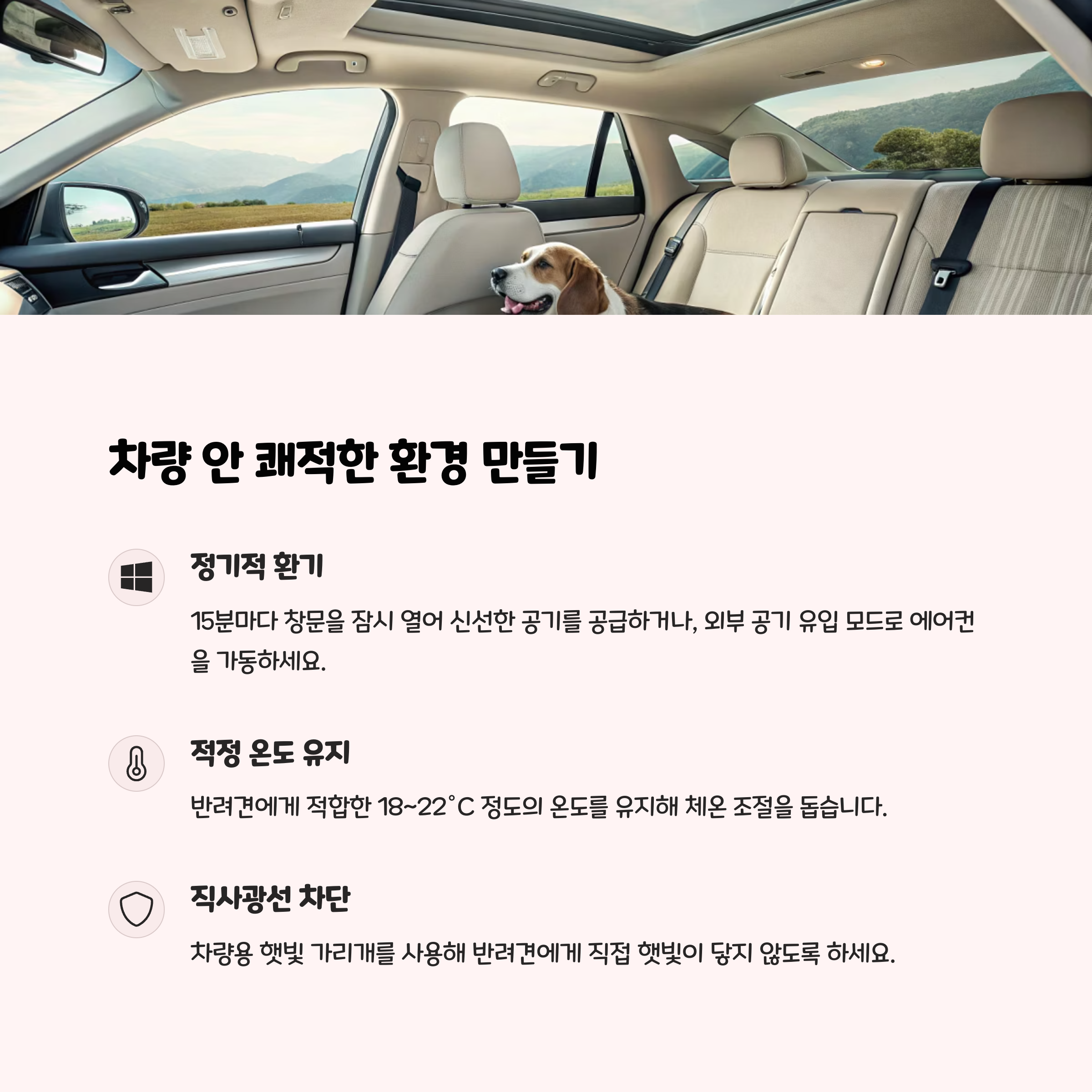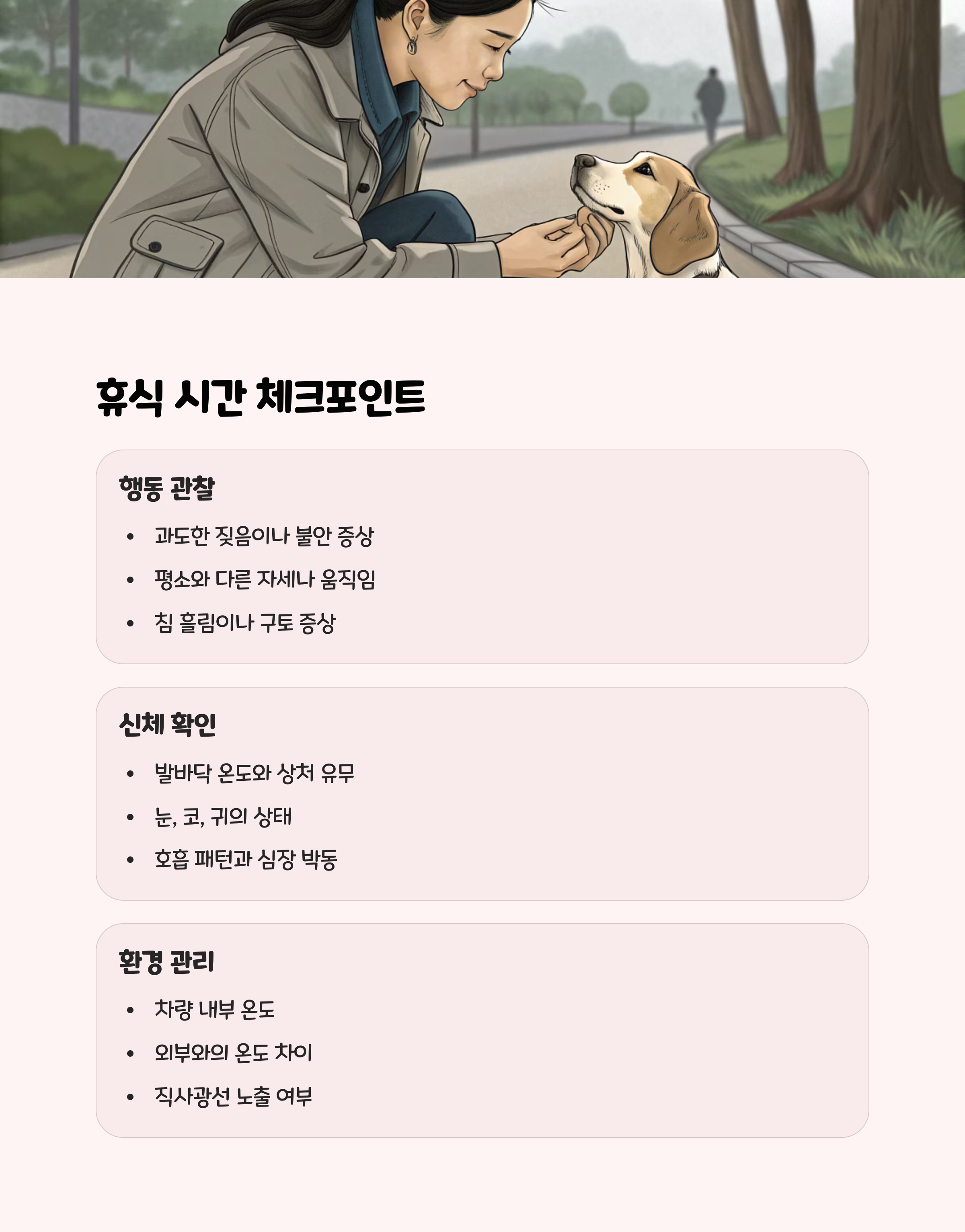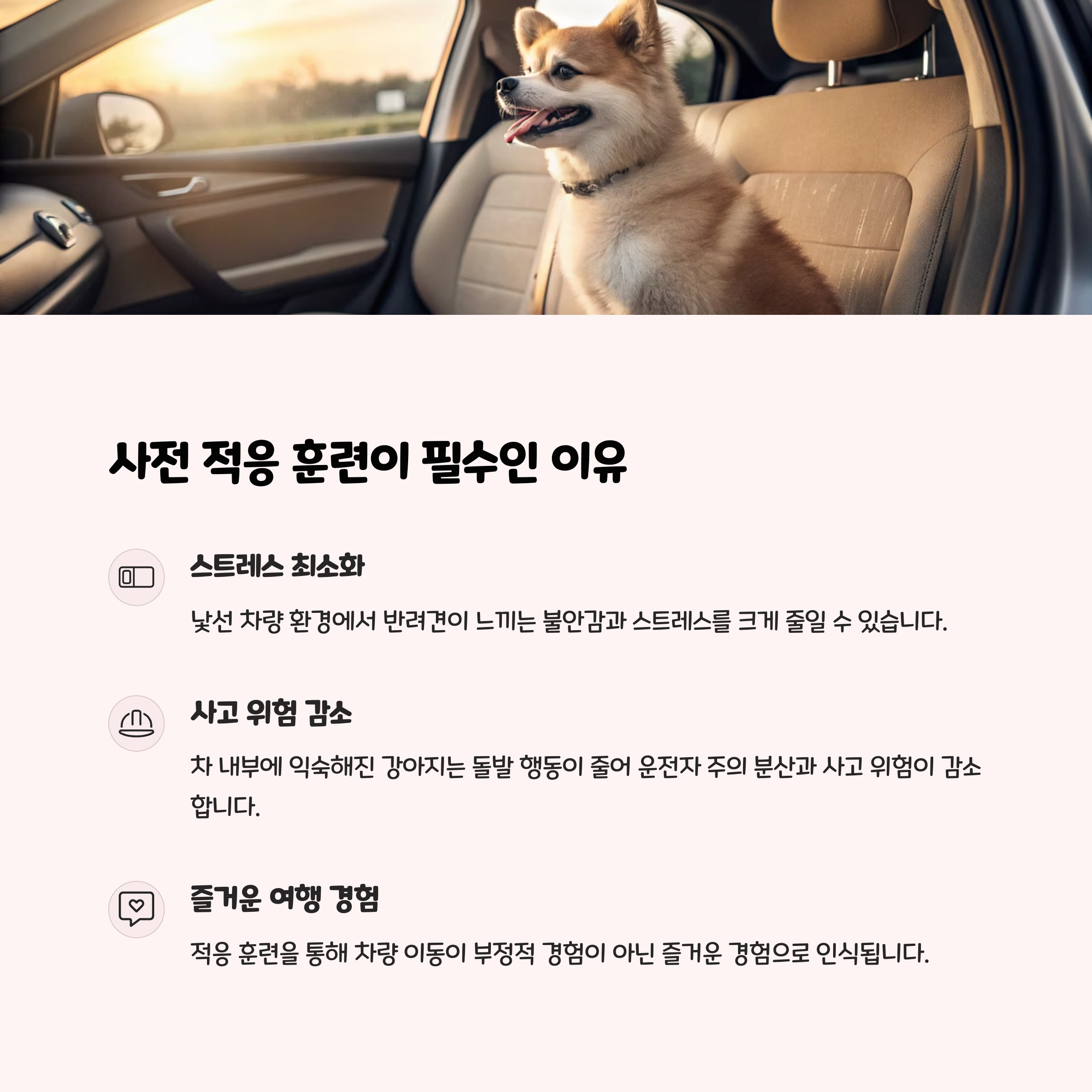 | 불안, 낑낑거림 | 짧은 산책, 차 내 장난감·담요로 안정감 제공 |