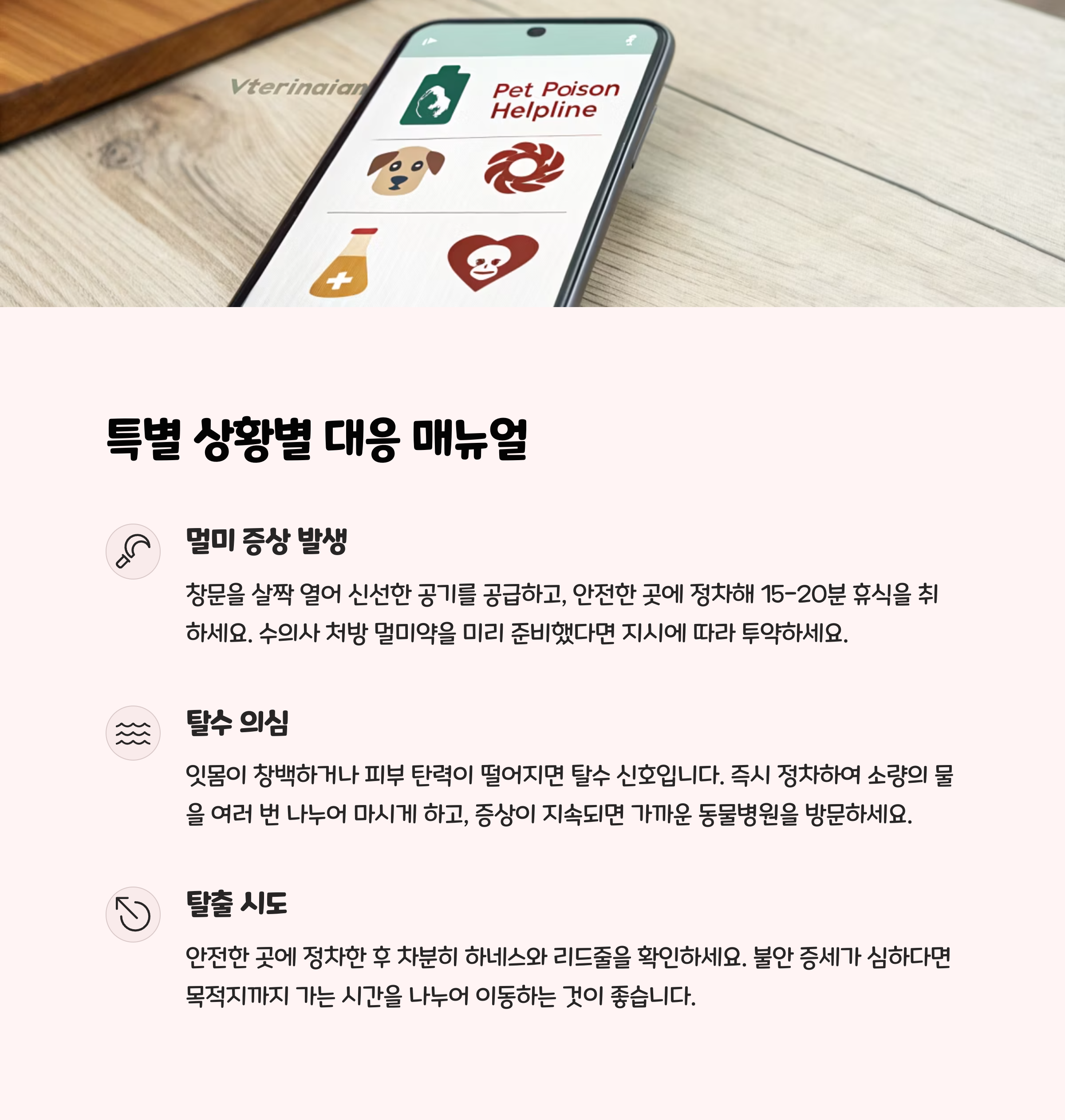 - 차량 주행 시 급정거·급출발 자제 : 부드러운 운전이 멀미 예방에 도움 됩니다. 필요시 수의사 상담 후 멀미약 처방: 반복적 멀미가 있다면 전문의 상담이 필요합니다.