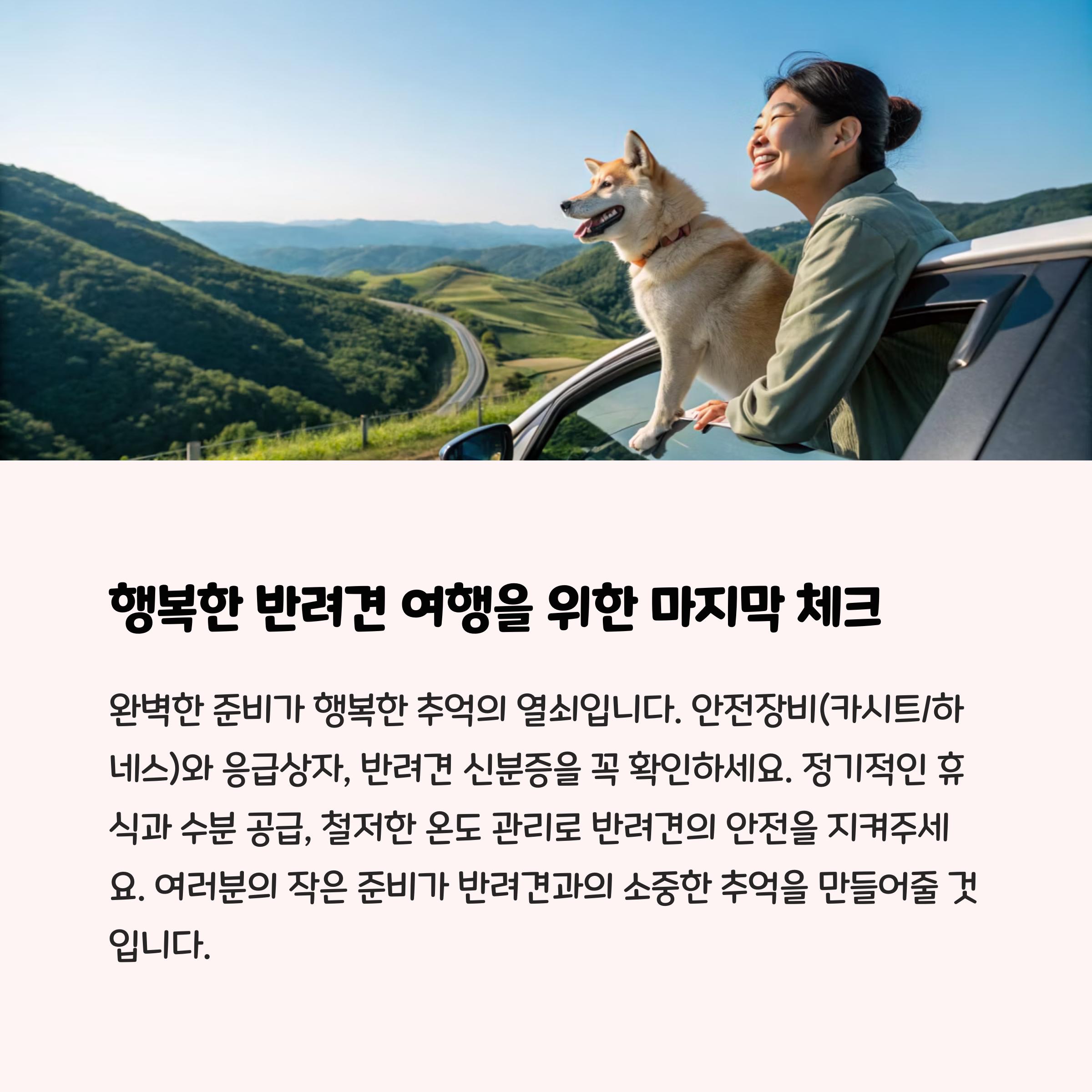 강아지와 함께하는 자동차 여행은 보호자의 준비와 배려에 따라 안전하고 즐거운 추억이 될 수 있습니다. 사전 적응 훈련, 안전한 탑승 장치, 멀미 예방, 정기적 휴식과 수분 보충, 그리고 긴급 상황 대비까지 꼼꼼히 준비한다면, 반려견과의 모든 여정이 행복으로 가득 찰 것입니다. 철저한 준비로 스트레스와 위험을 줄이고, 반려견과 함께하는 특별한 순간을 만끽하세요.