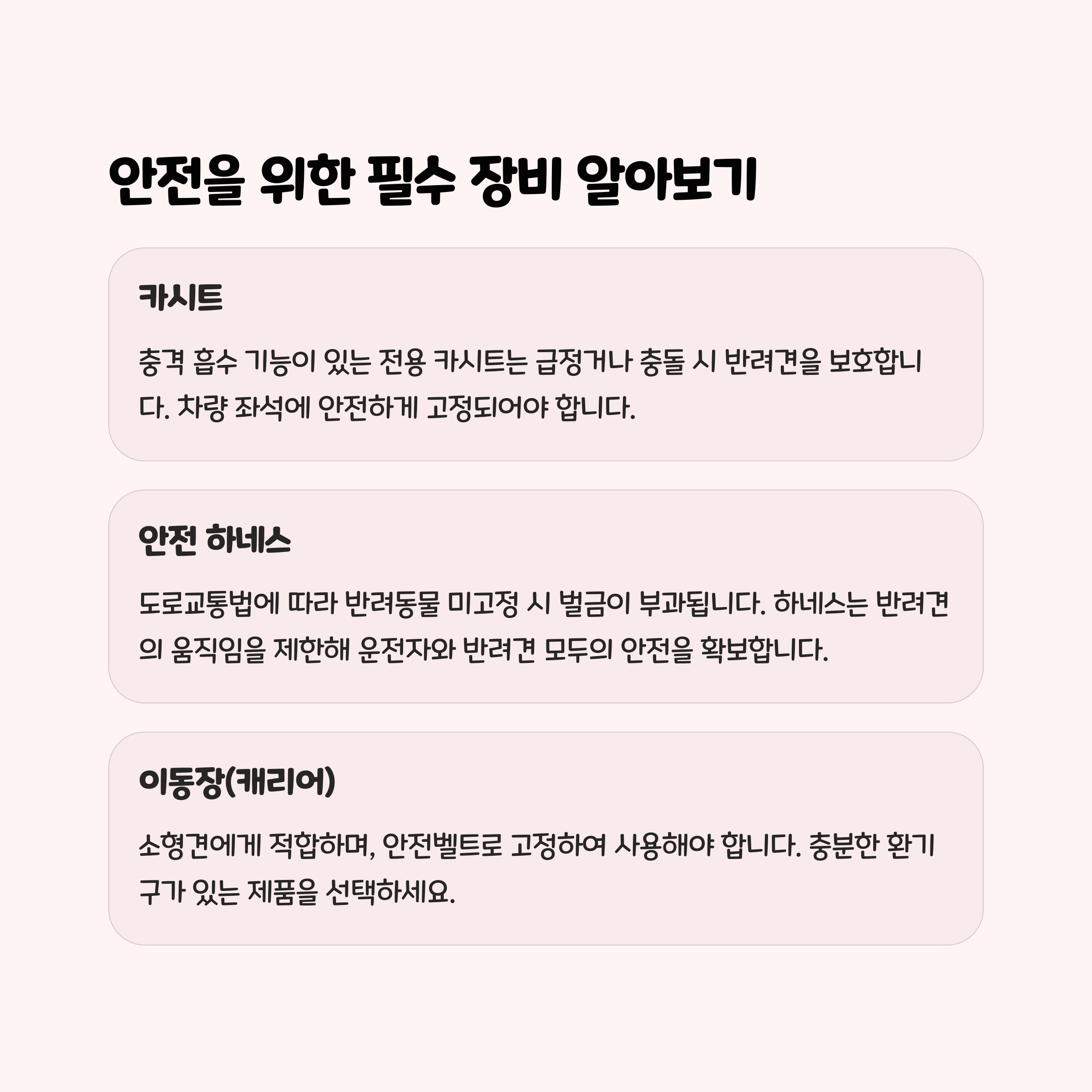 | 전용 카시트 | ★★★★☆ | 소형견, 단거리 이동 |