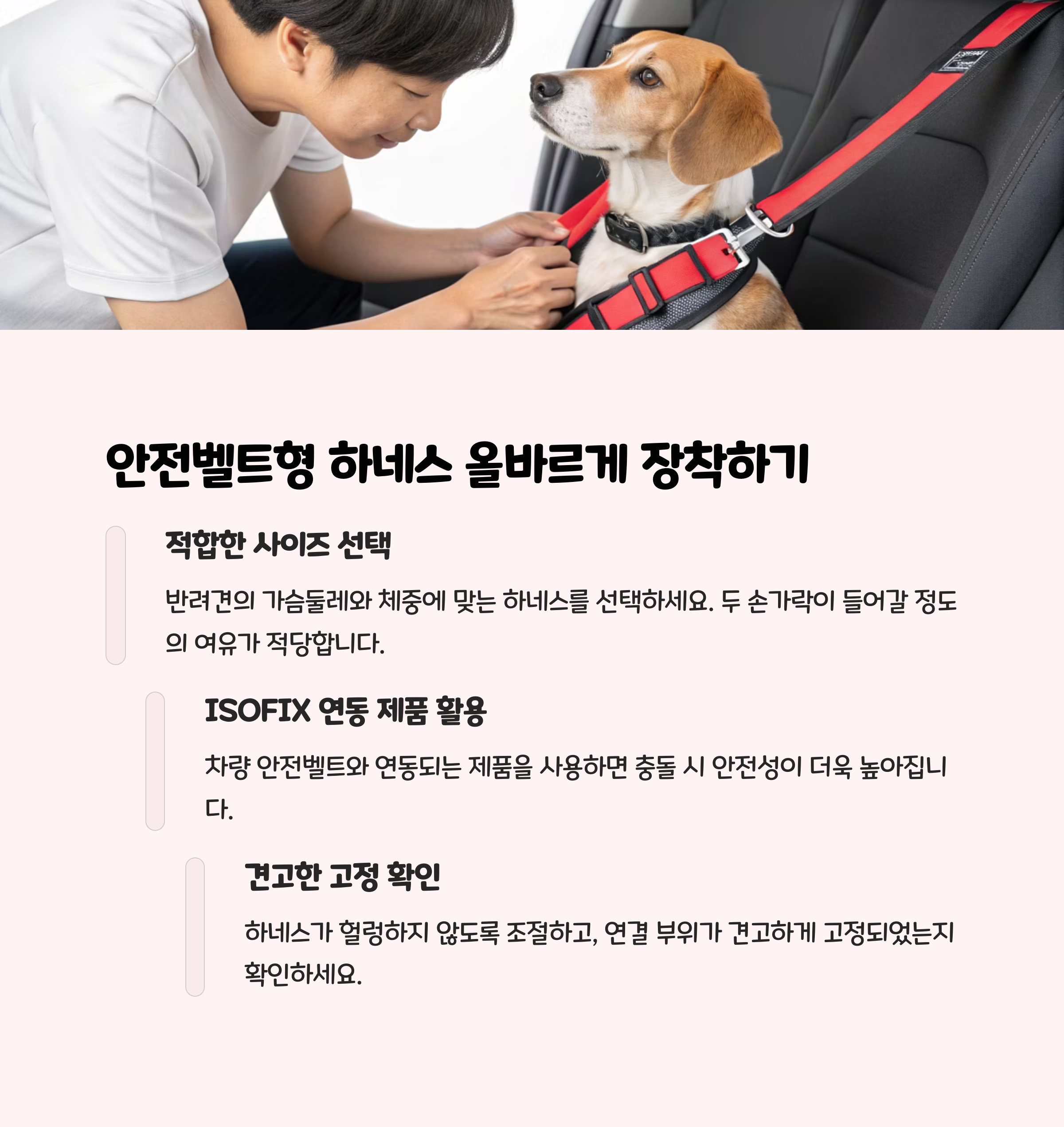 | 하네스+안전벨트 | ★★★☆☆ | 대형견, 단거리 이동 |