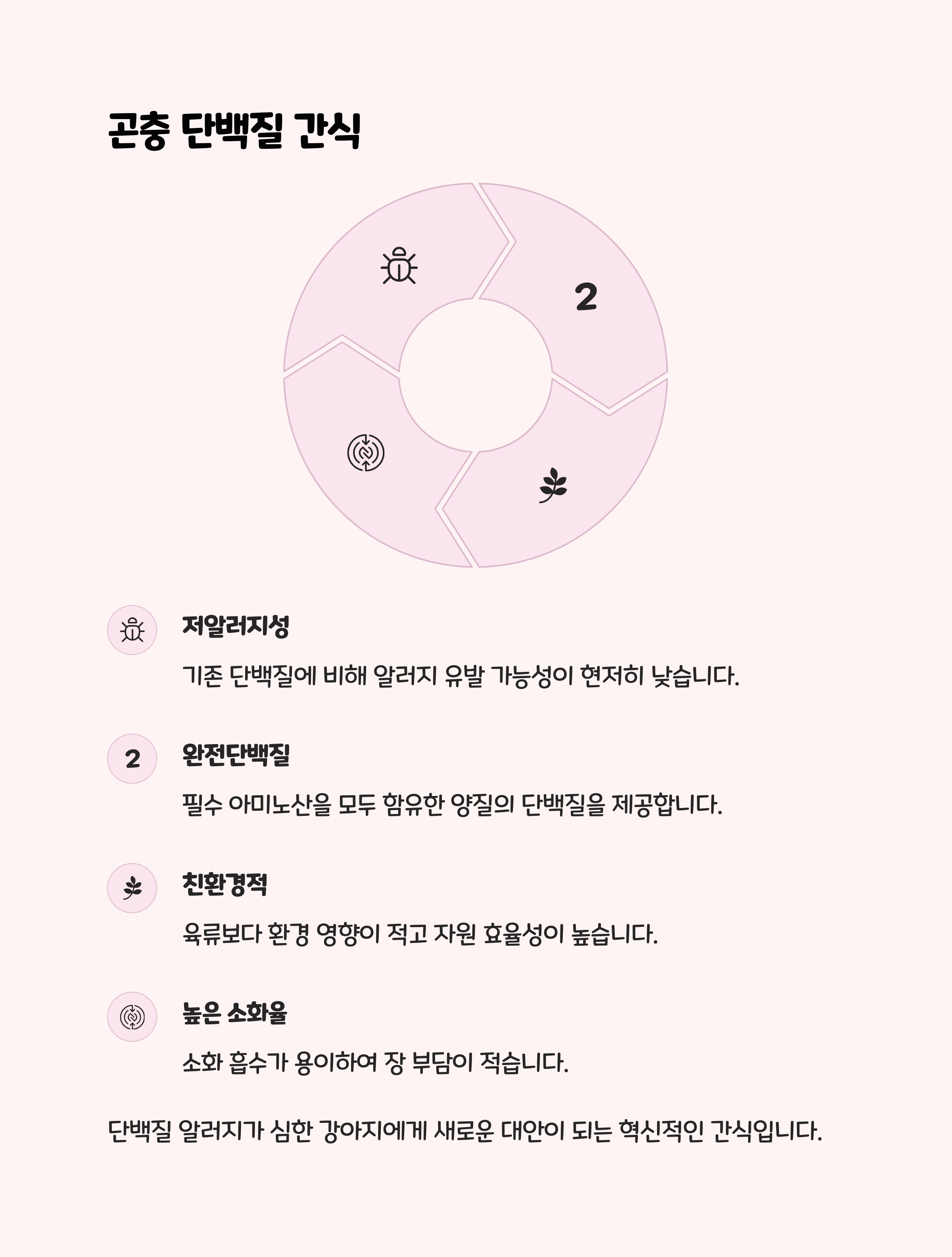 • 특징 : 곤충 단백질은 기존 육류에 비해 알러지 유발 가능성이 매우 낮아 최근 각광받고 있습니다. 저칼로리, 고단백이라 훈련용 보상 간식으로도 적합합니다.