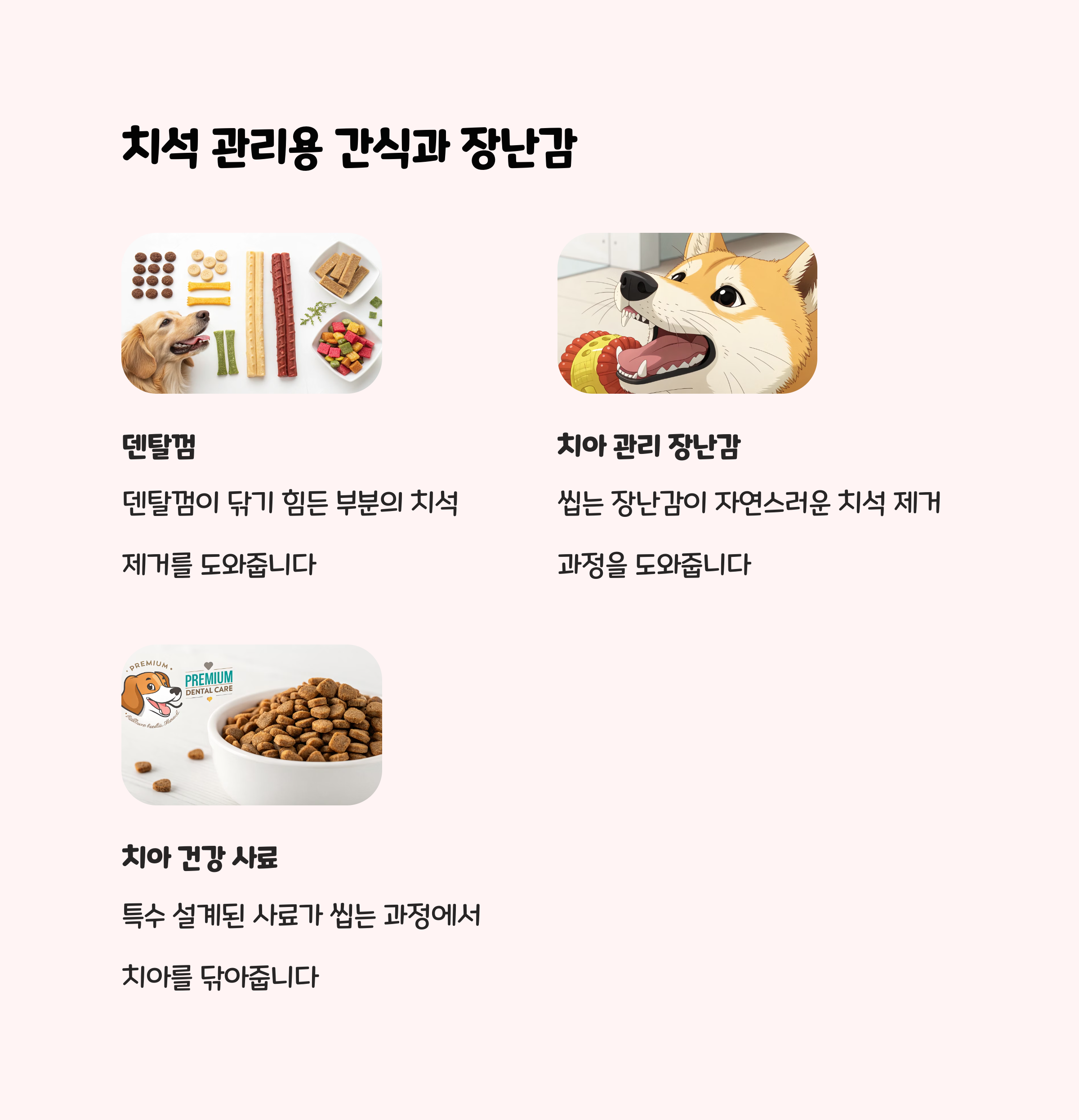 - 단, 너무 딱딱한 간식은 치아 손상 위험이 있으니 적당한 강도의 제품을 선택하세요.