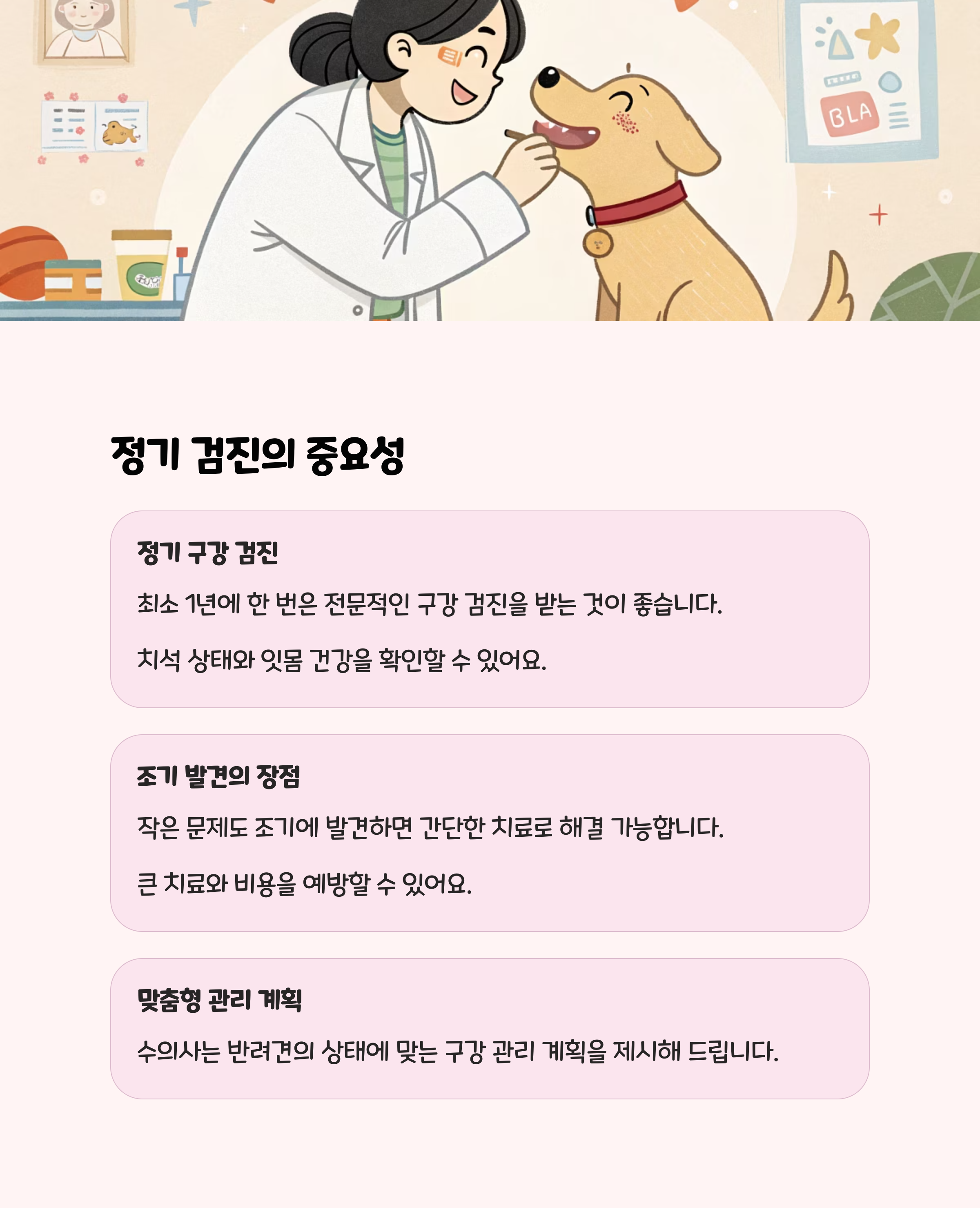 1년에 한 번 이상 동물병원에서 치아 검진을 받는 것이 좋습니다.- 치석이 심하게 쌓였다면, 반드시 전문가의 진료와 스케일링을 받아야 합니다.
