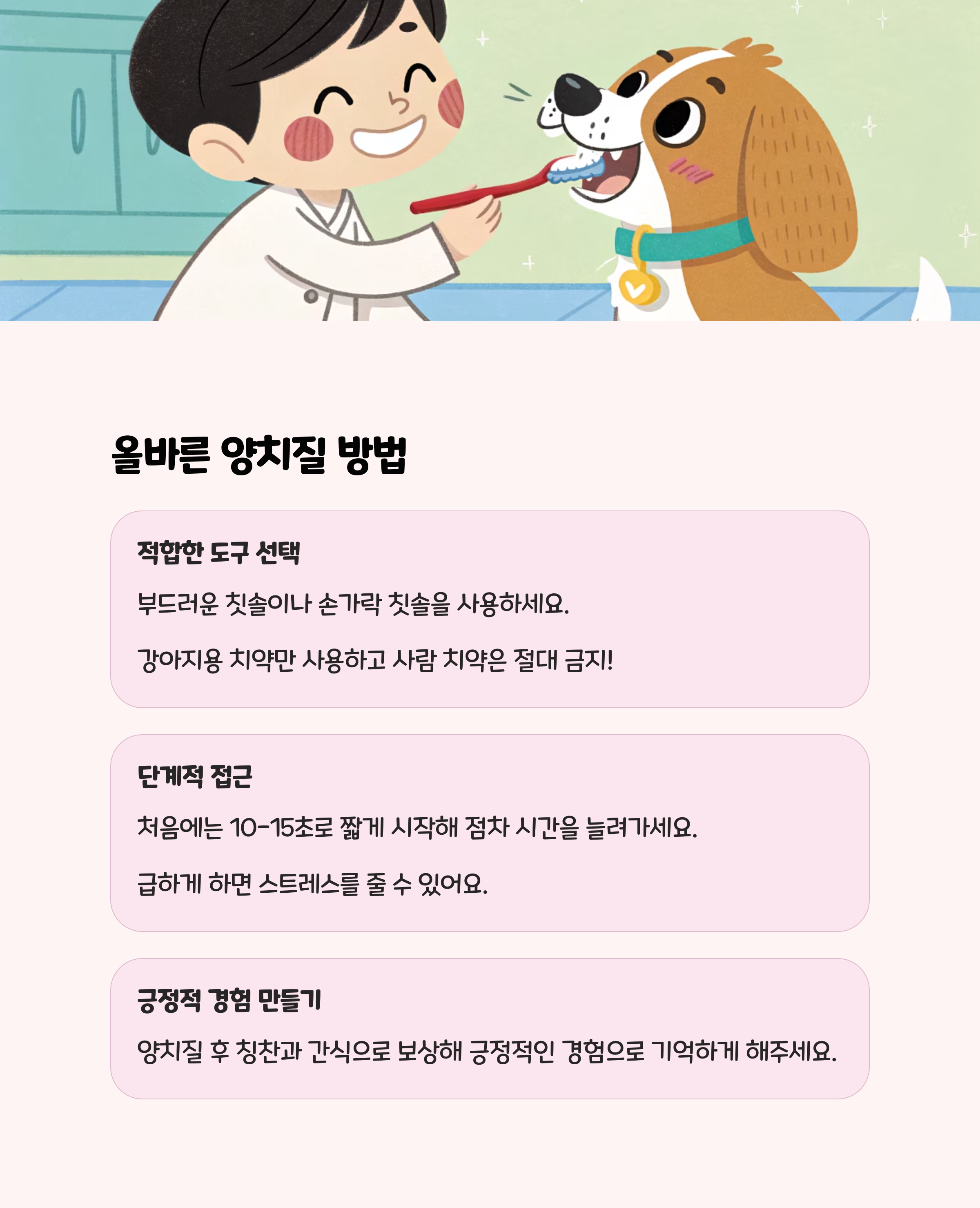 치석 예방의 핵심은 매일 양치질입니다.- 강아지 전용 치약과 칫솔을 사용하고, 하루 한 번 이상 닦아주세요.