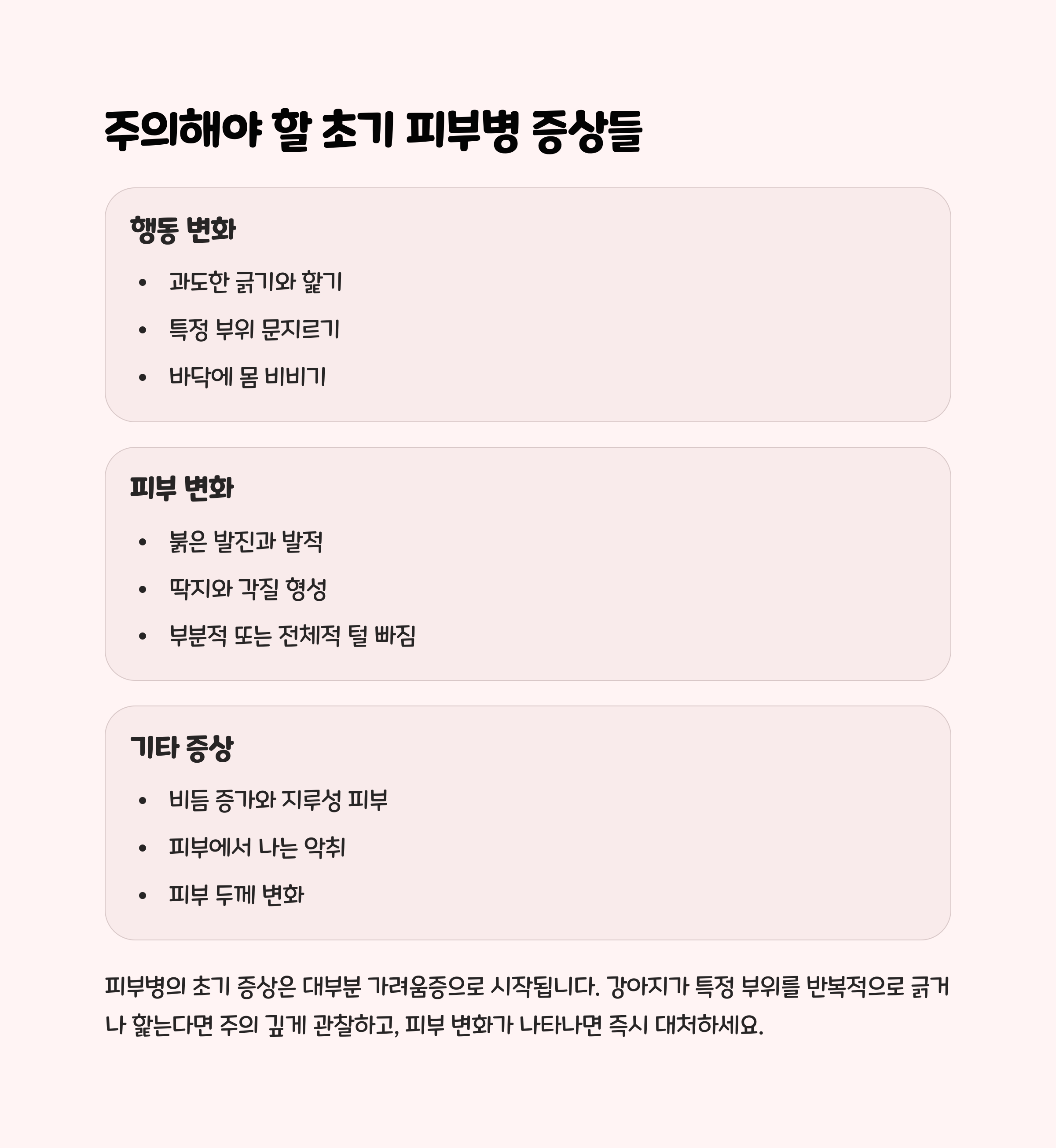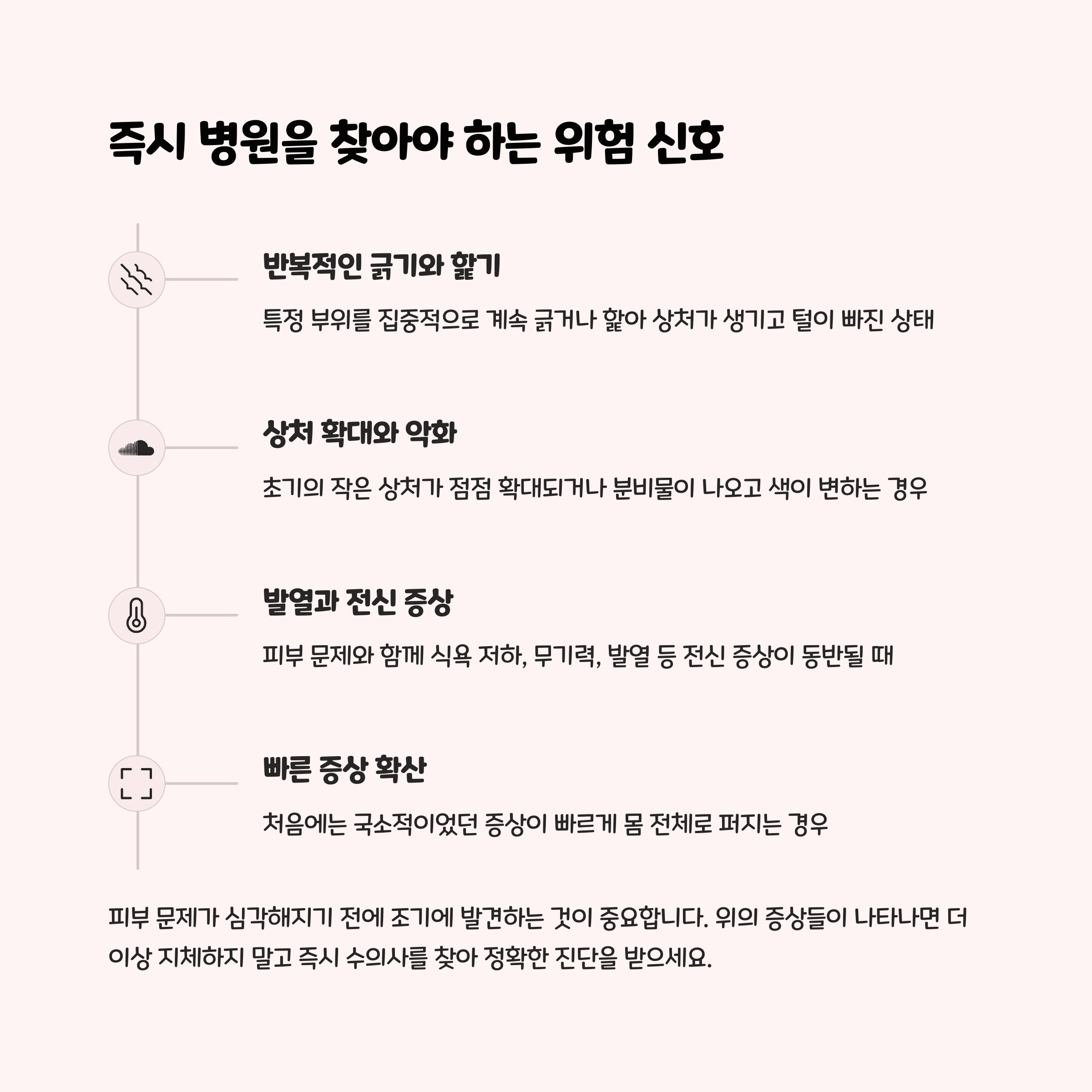 이러한 증상이 나타나면 빠르게 대처해야 합니다. 초기 치료가 이루어지지 않으면 피부병이 악화되어 이차 감염으로 이어질 수 있습니다.