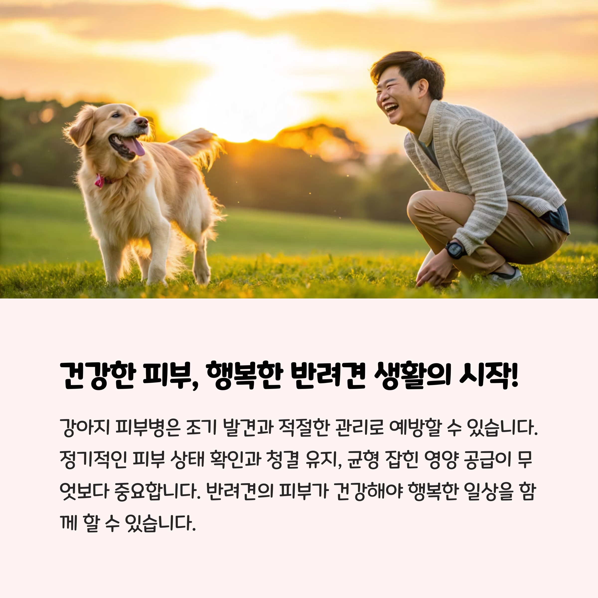 강아지 피부병은 조기에 발견하고 적절히 관리하면 쉽게 치료할 수 있습니다. 집에서 실천할 수 있는 예방 및 관리 방법을 통해 반려견의 건강을 지켜주세요. 만약 증상이 지속되거나 악화된다면 반드시 동물병원에서 전문적인 진단과 치료를 받는 것이 필요합니다.