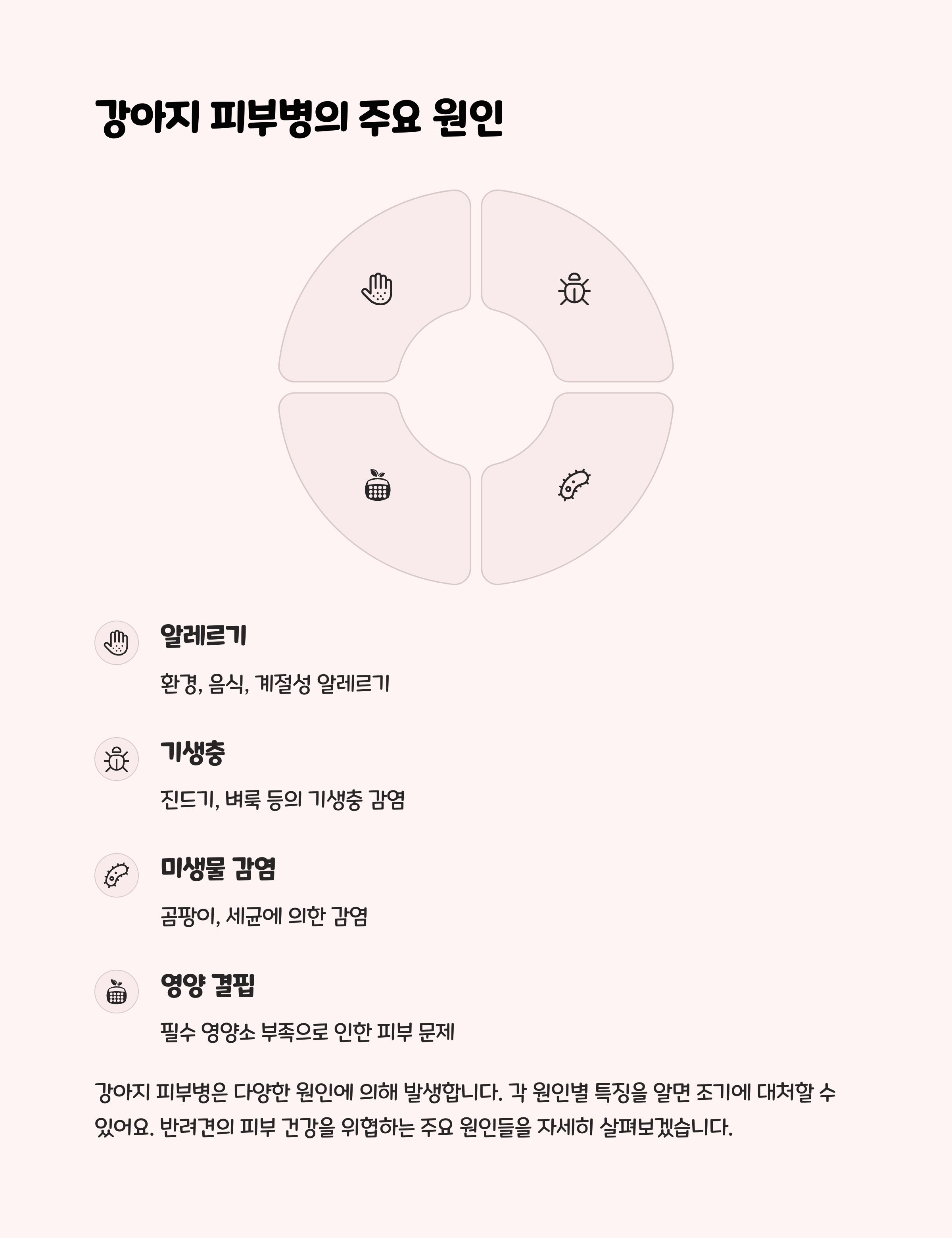 강아지 피부병은 반려견을 키우는 사람들에게 흔히 발생하는 고민 중 하나입니다. 피부병은 강아지의 건강과 삶의 질에 큰 영향을 미칠 수 있기 때문에, 원인을 정확히 이해하고 초기 증상을 파악하여 적절히 대처하는 것이 중요합니다. 이 글에서는 강아지 피부병의 주요 원인 5가지, 초기 증상, 그리고 집에서 해결할 수 있는 방법에 대해 알아보겠습니다.