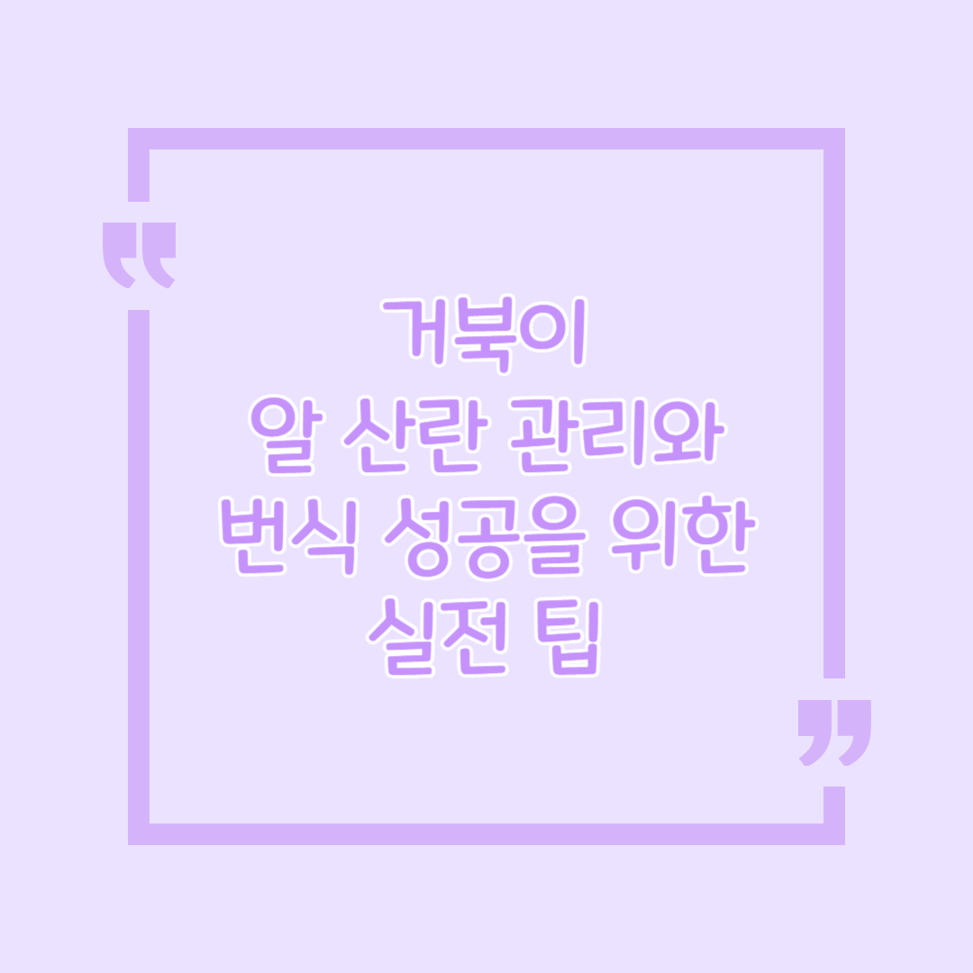 산란 장소 마련: 20~30cm 깊이의 모래나 부드러운 배양토를 사용하여 조용하고 적당한 습도(60~70%)가 유지되는 공간을 만듭니다.적절한 온도 관리: 알 부화에 최적 온도는 28~30℃, 습도는 70~80%로 유지합니다.안정적인 환경 유지: 산란 후 알은 원래 방향을 절대 바꾸지 말고, 곰팡이 발생 방지를 위해 정기적으로 통풍을 시켜줍니다.