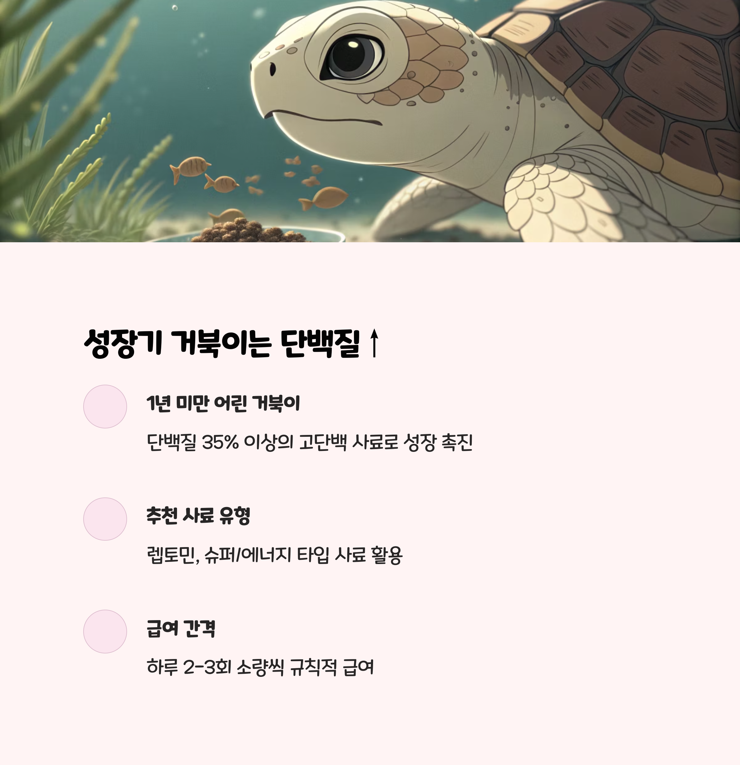 - 동물성 사료(예: 감마루스, 밀웜, 생이새우)는 성장기 거북이에게 단백질 공급원으로 좋습니다.