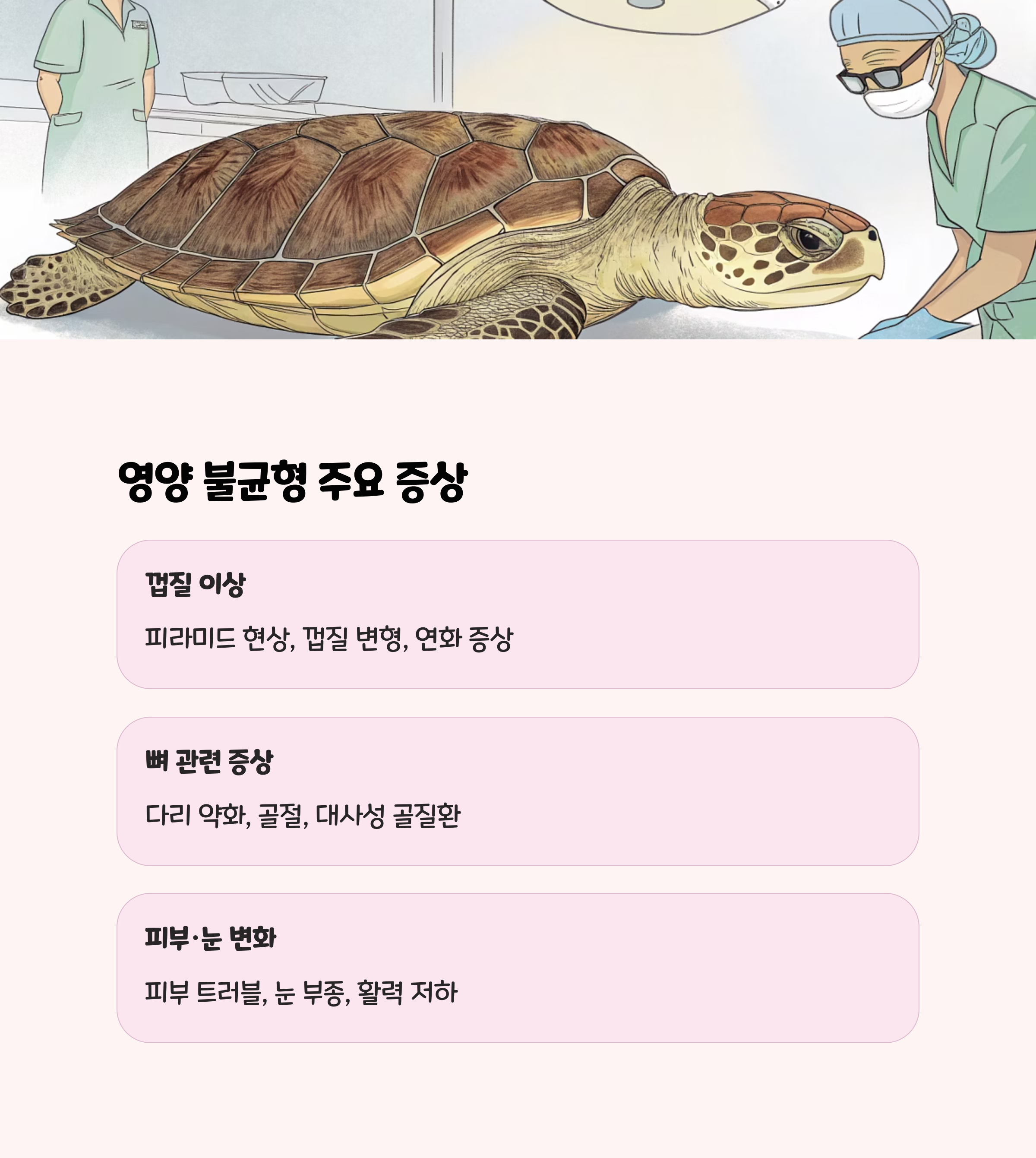 칼슘:인 비율이 최소 2:1 이상인 사료를 선택해야 합니다. - 국내 사료는 인 함량이 더 높은 경우가 많으므로, 구매 전 반드시 성분표를 확인하세요.