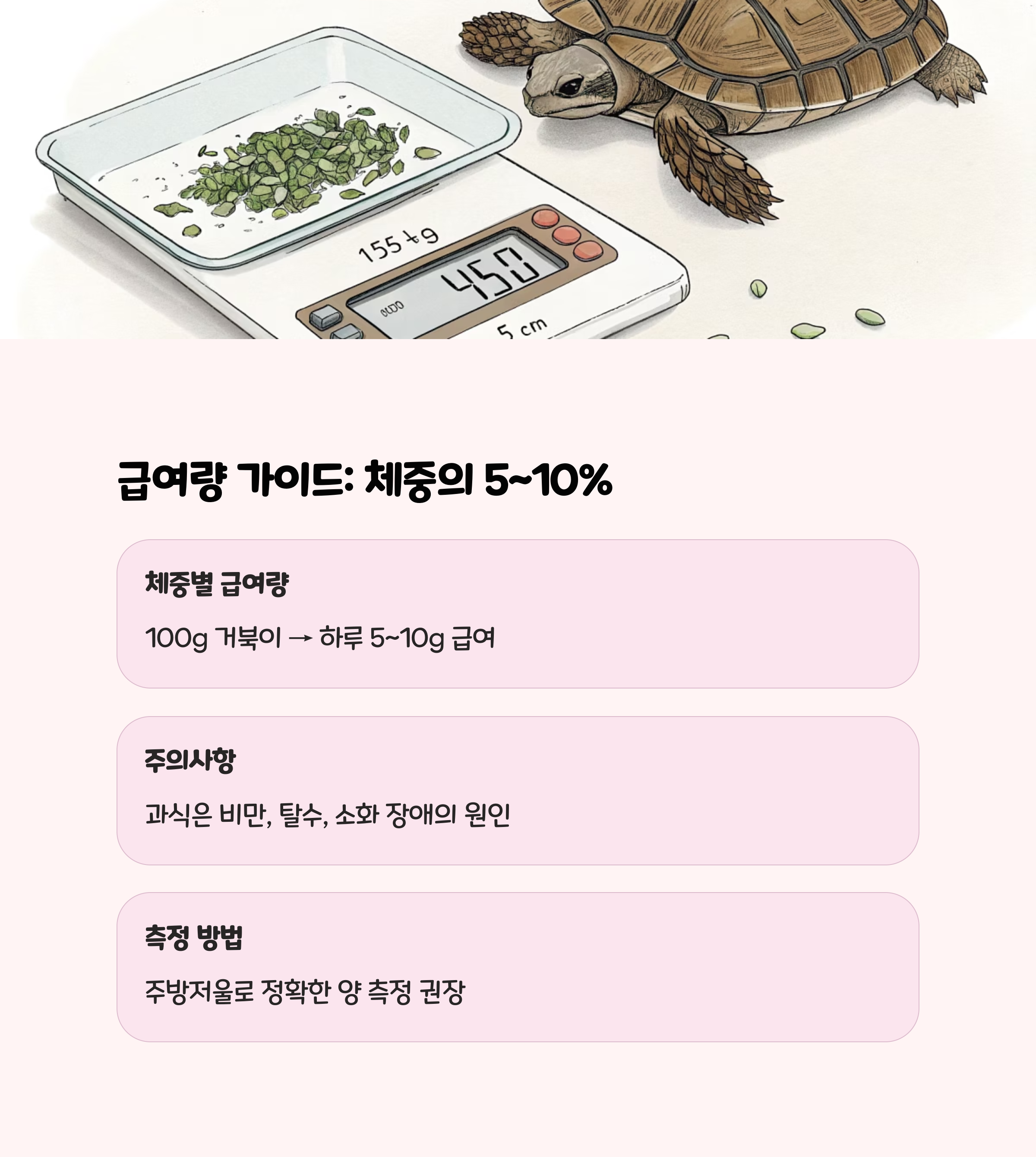 - 일반적으로 거북이 체중의 5~10%를 1회 급여량으로 삼으면 건강한 체중을 유지할 수 있습니다.