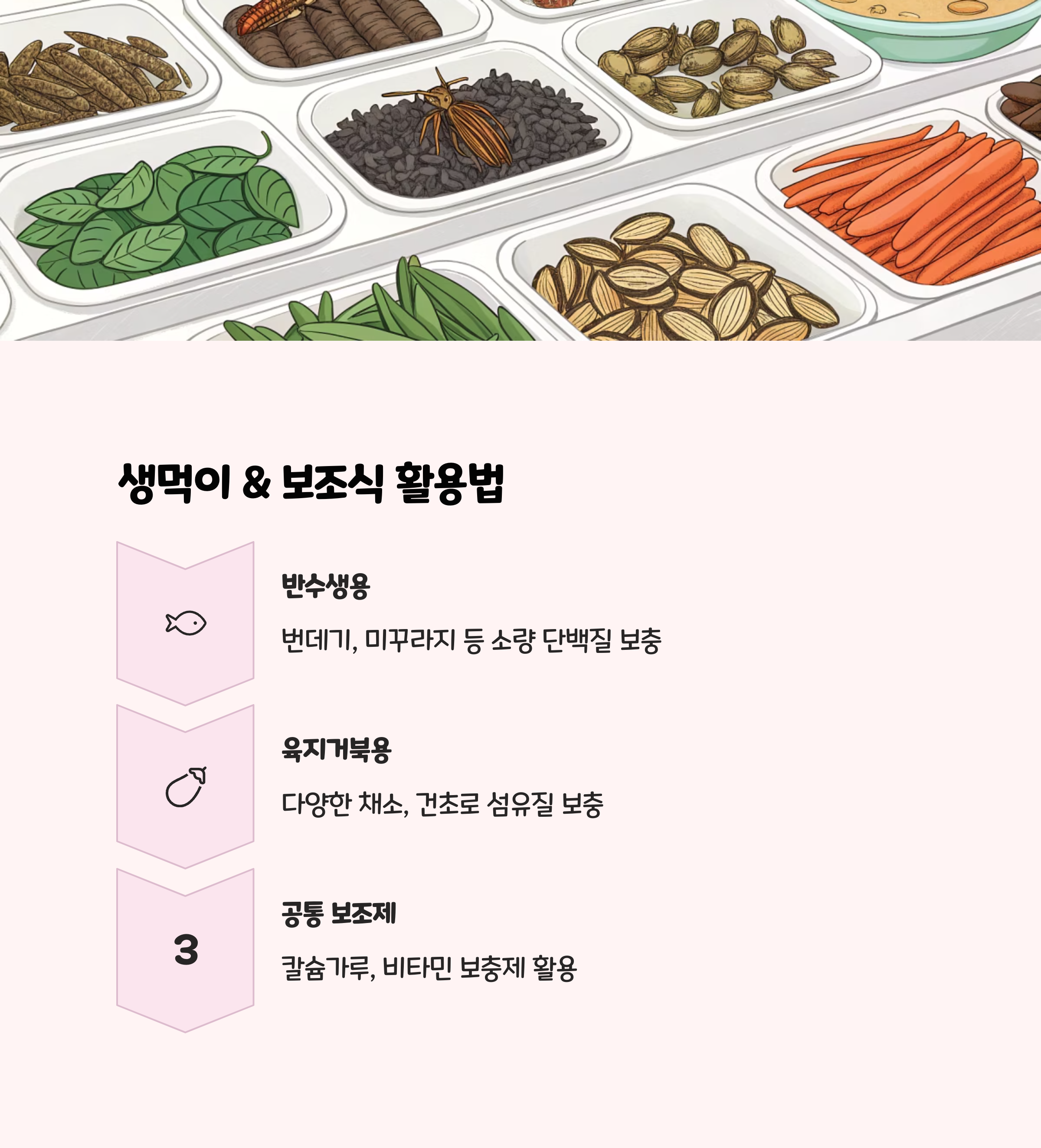 주식 사료 외에도 섬유질이 풍부한 보조 사료(수초, 민들레 등)와 생먹이(생이새우, 저렴한 소형어류)를 주 1~2회 급여하면 영양 불균형을 예방할 수 있습니다.