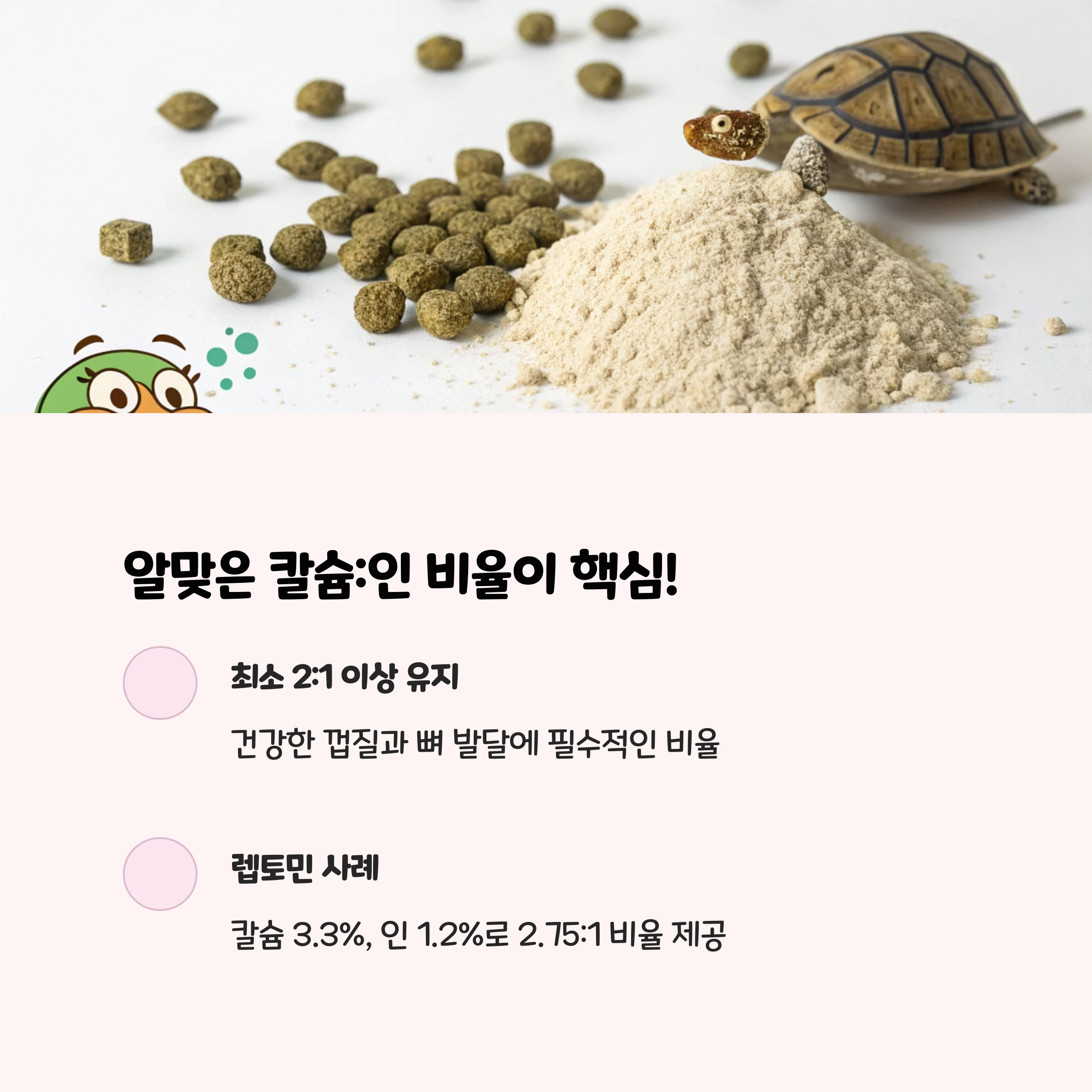 | 렙토민(Repto-Min) | 39% | 2% | 3.3% | 1.2% | 성장기~성체 모두 사용, 칼슘:인 비율 우수 |