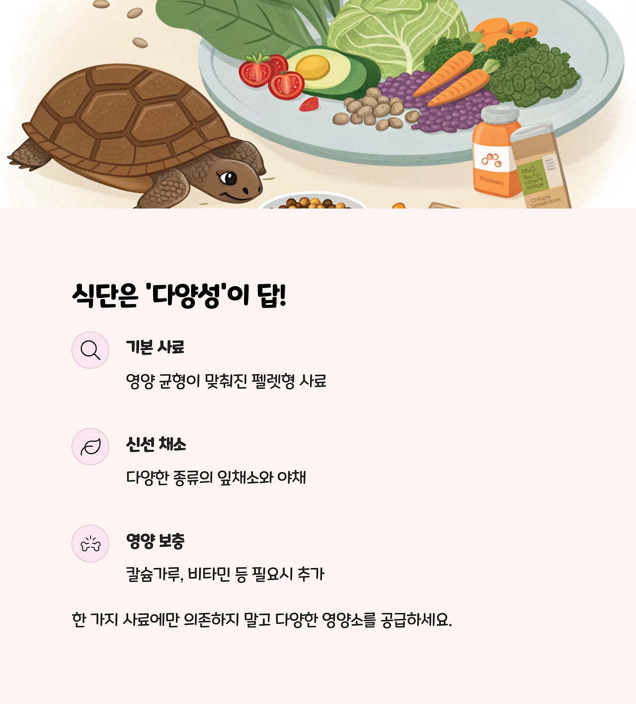 사료 선택 시 칼슘:인 비율, 섬유질 함량, 단백질 함량을 반드시 비교하세요.주 1~2회는 상추, 민들레, 시금치 등 신선한 채소를 특식으로 급여하면 건강에 도움이 됩니다.