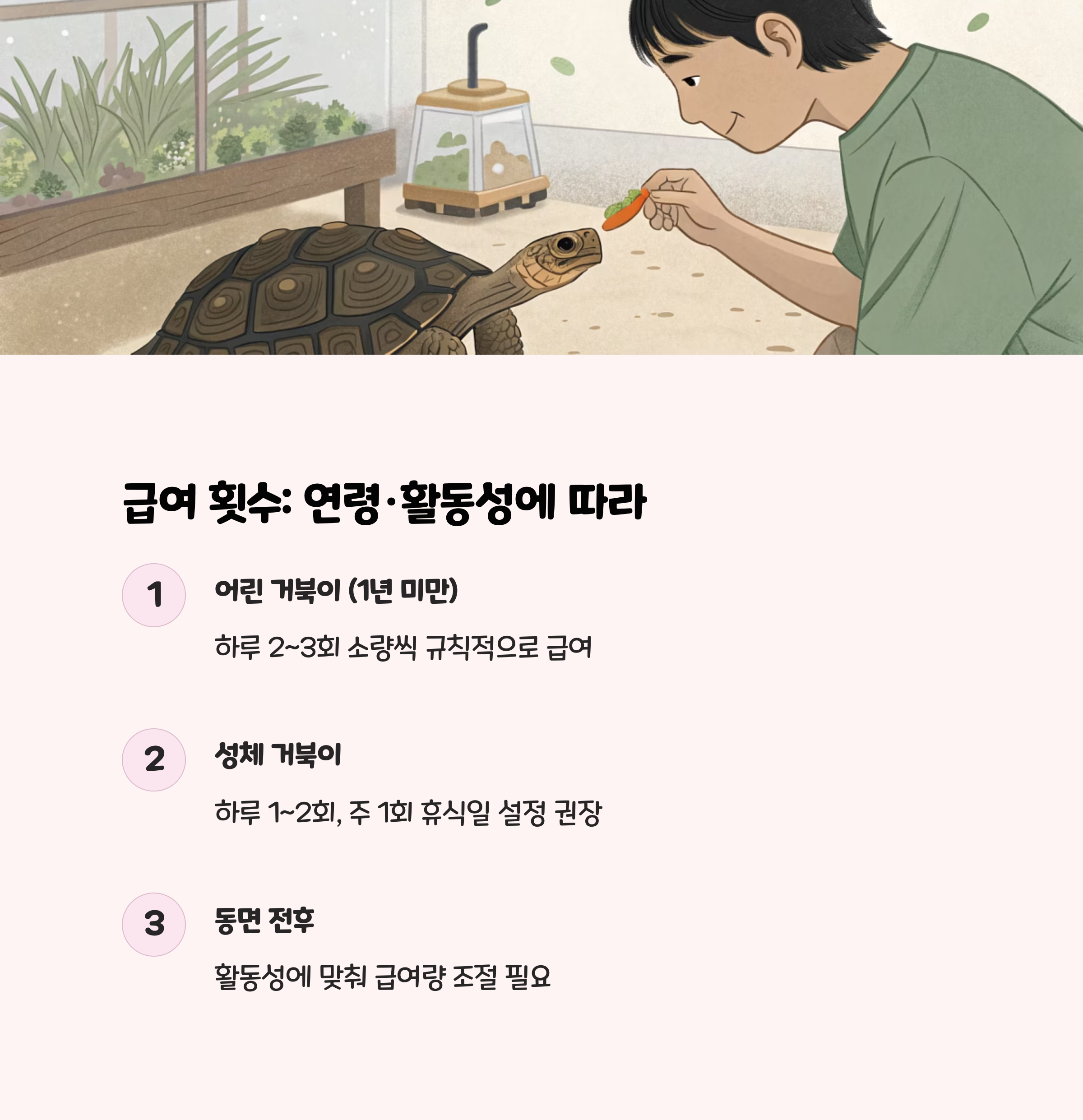 거북이 배갑(등껍질) 크기만큼의 사료를 하루에 두 번 나누어 주는 방법도 있습니다.- 성장기(헤츨링, 아성체)는 하루 1~2회, 성체는 주 2~3회 급여가 적당합니다.