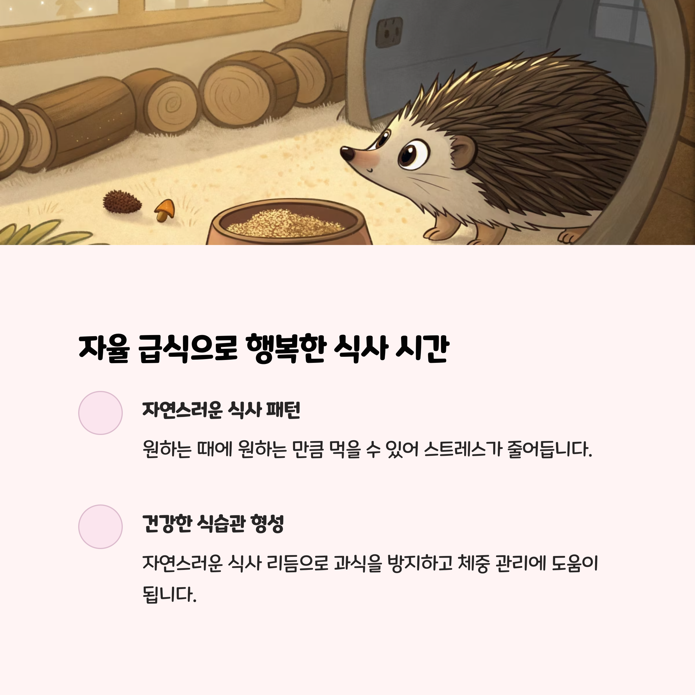 자율 급식: 고슴도치는 스트레스에 민감하므로, 사료를 넉넉히 제공하고 자율적으로 먹게 하는 것이 좋습니다.사료 변경 시 적응 기간: 기존 사료와 새 사료를 1~2주간 섞어 급여하며 천천히 바꿔주세요.적정 체중 관리: 성체 고슴도치는 400~650g이 적정 체중입니다. 과체중일 경우 사료의 지방 함량을 낮추고, 운동량을 늘려주세요.간식 과다 급여 금지: 단백질 과다 섭취는 소화 장애와 변비, 수명 단축의 원인이 될 수 있습니다.