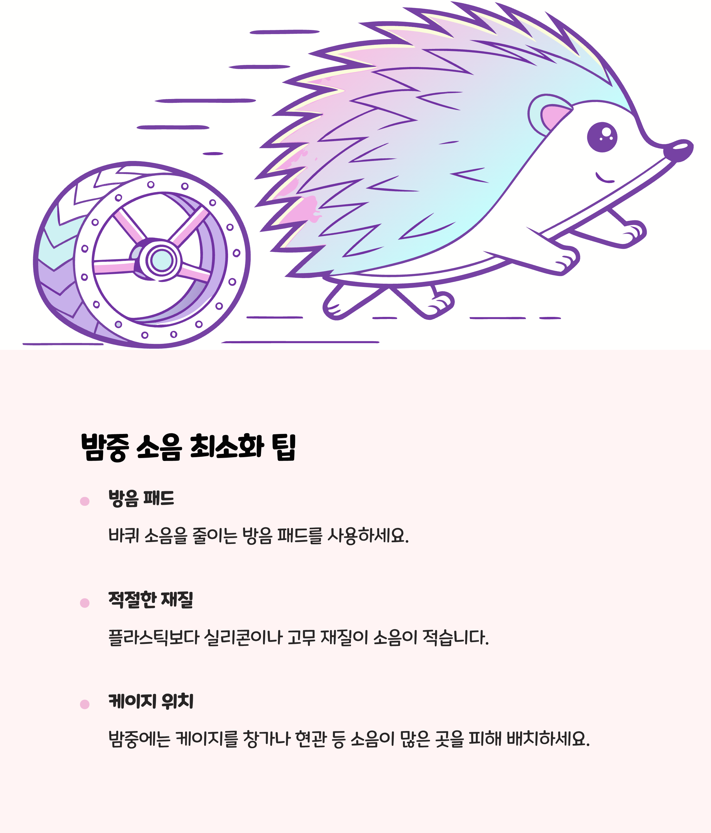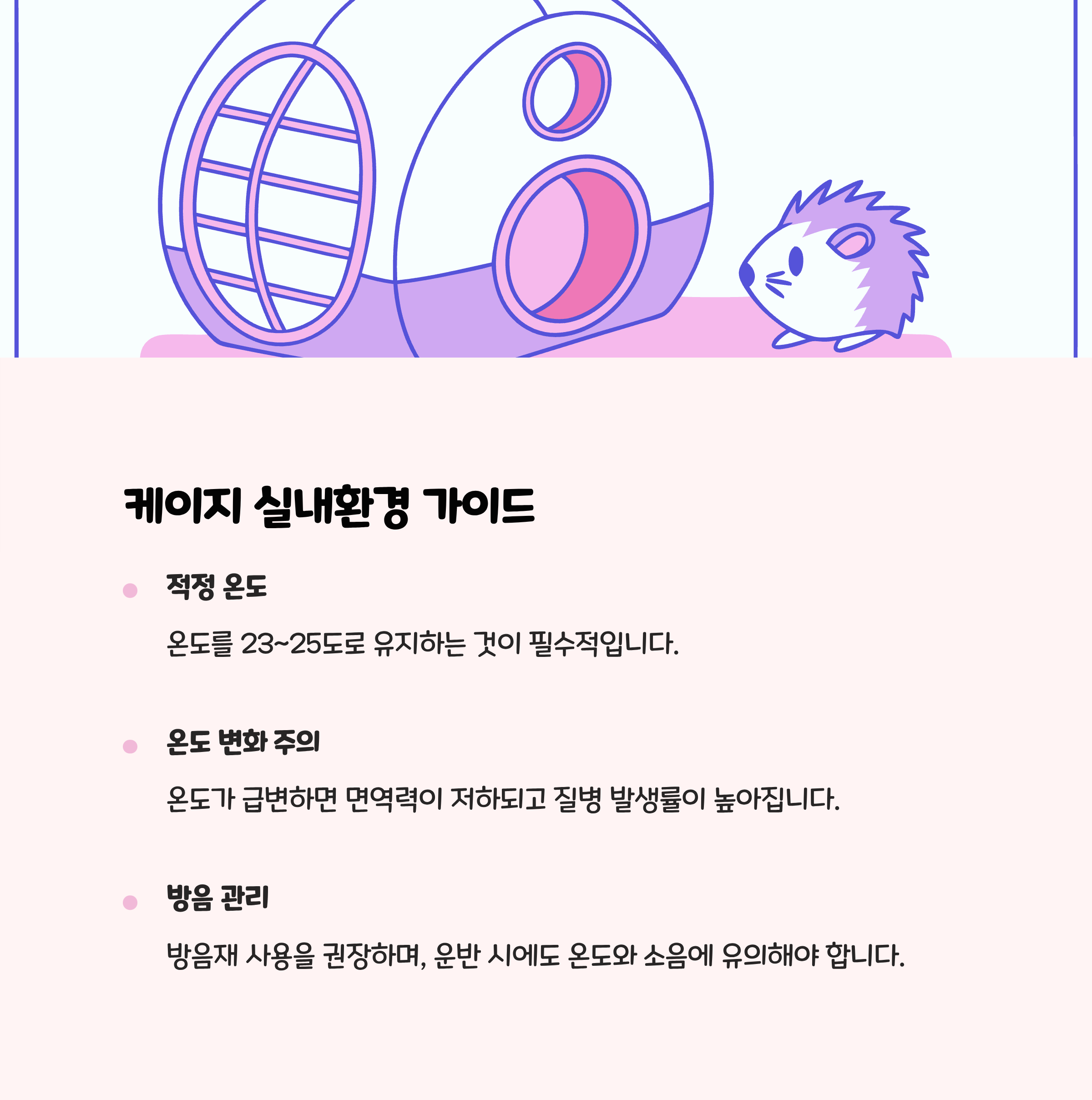 - 밤에 소리가 많이 난다면, 케이지 하단에 소음 방지 매트를 깔아 습도와 소리를 모두 잡으세요.