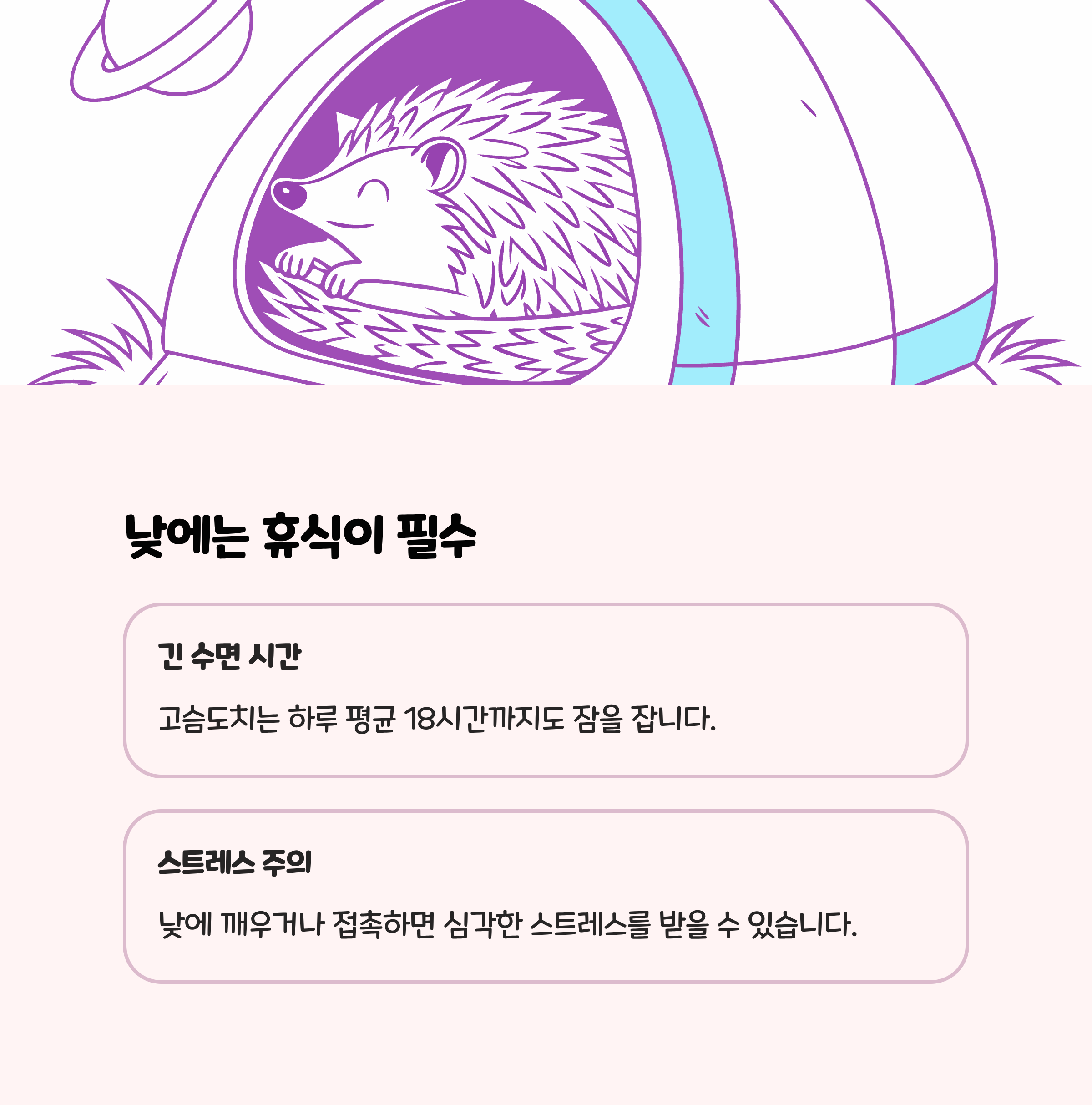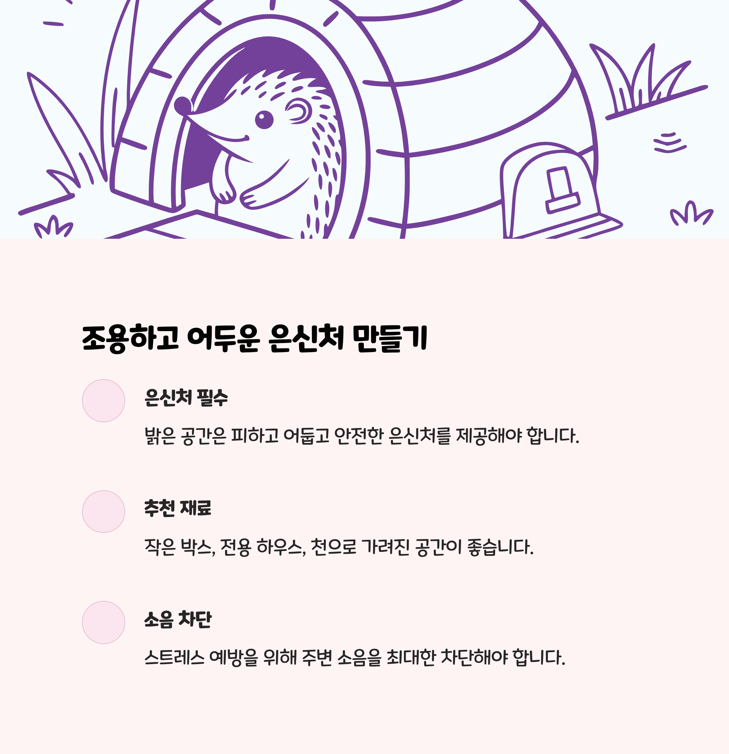 고슴도치는 밤에 활동하므로 낮에 충분히 휴식하지 못하면 스트레스를 받고, 면역력이 약해질 수 있습니다. 낮에는 항상 은신처를 제공해 자연스럽게 쉴 수 있도록 해야 합니다.