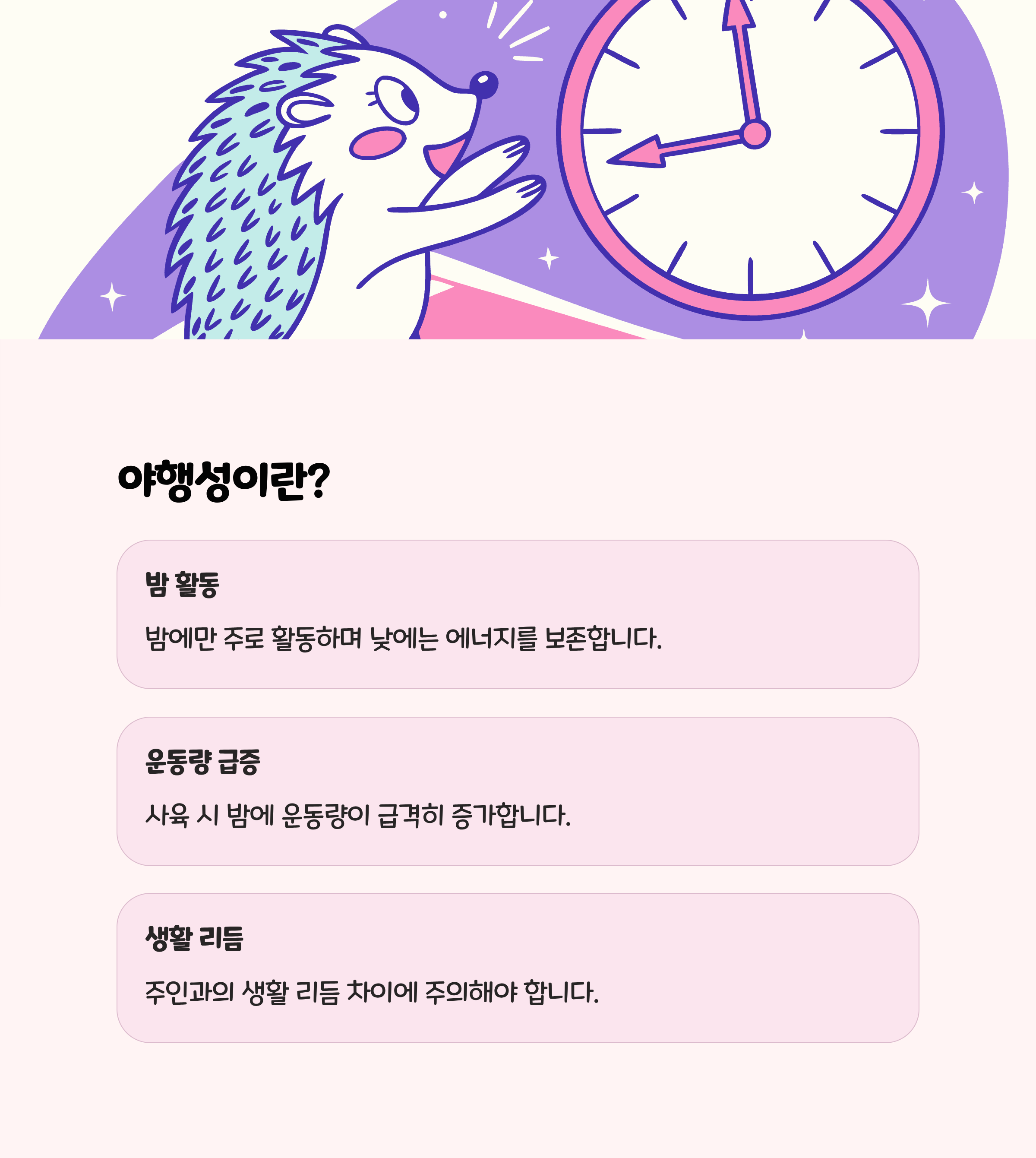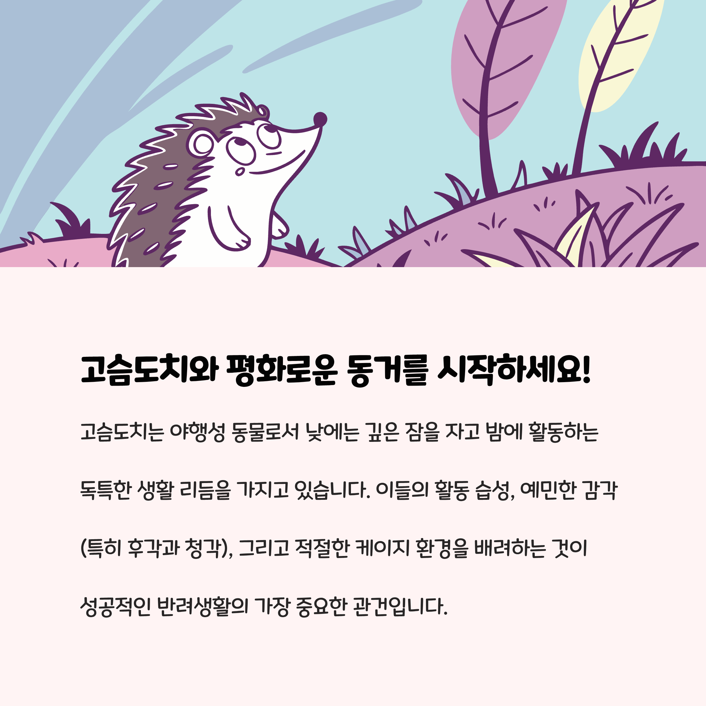 고슴도치를 처음 키우거나, 밤에 활동하는 고슴도치 때문에 걱정이 많으셨던 분들께 실질적인 해결책과 함께 고슴도치의 야행성 특징, 그리고 밤에도 조용히 키울 수 있는 방법을 안내해 드립니다.