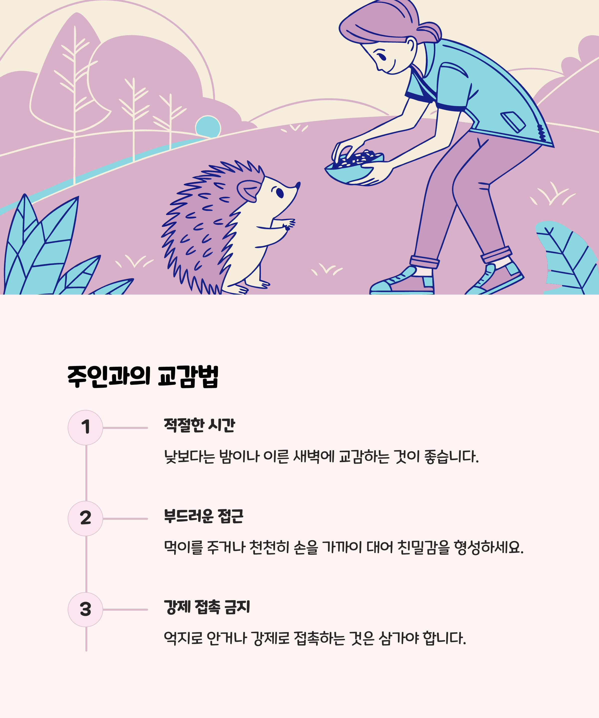갑작스러운 손길보다는 밤에 부드럽게 손 냄새를 맡게 하거나, 먹이를 직접 주며 차분하게 접근합니다. 인내심을 갖고 천천히 다가가면 스트레스 없이 친밀해집니다.
