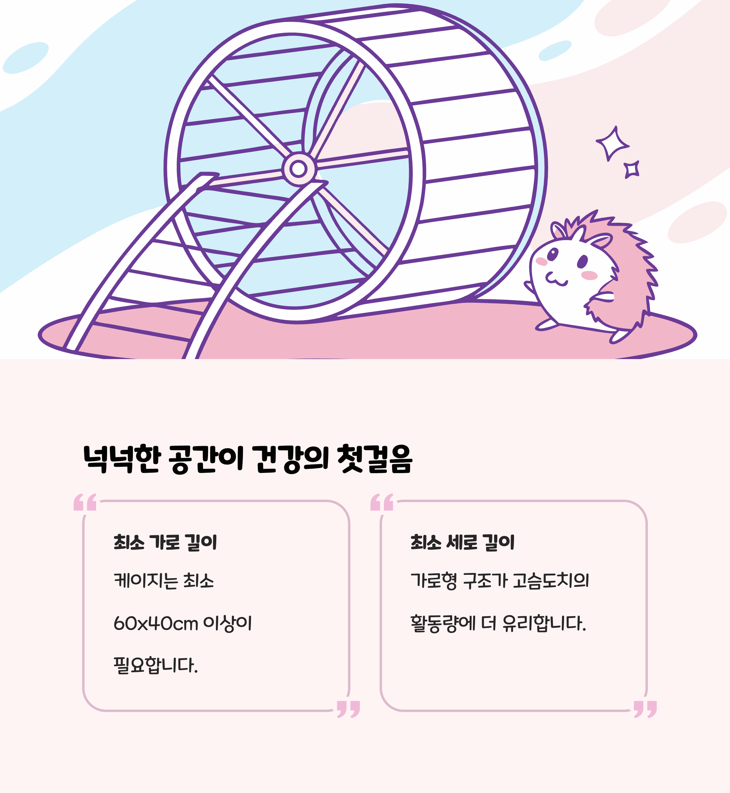 - 고슴도치는 넓은 공간이 필요합니다. 작은 케이지는 스트레스 유발, 소음 행동을 증가시킬 수 있습니다.