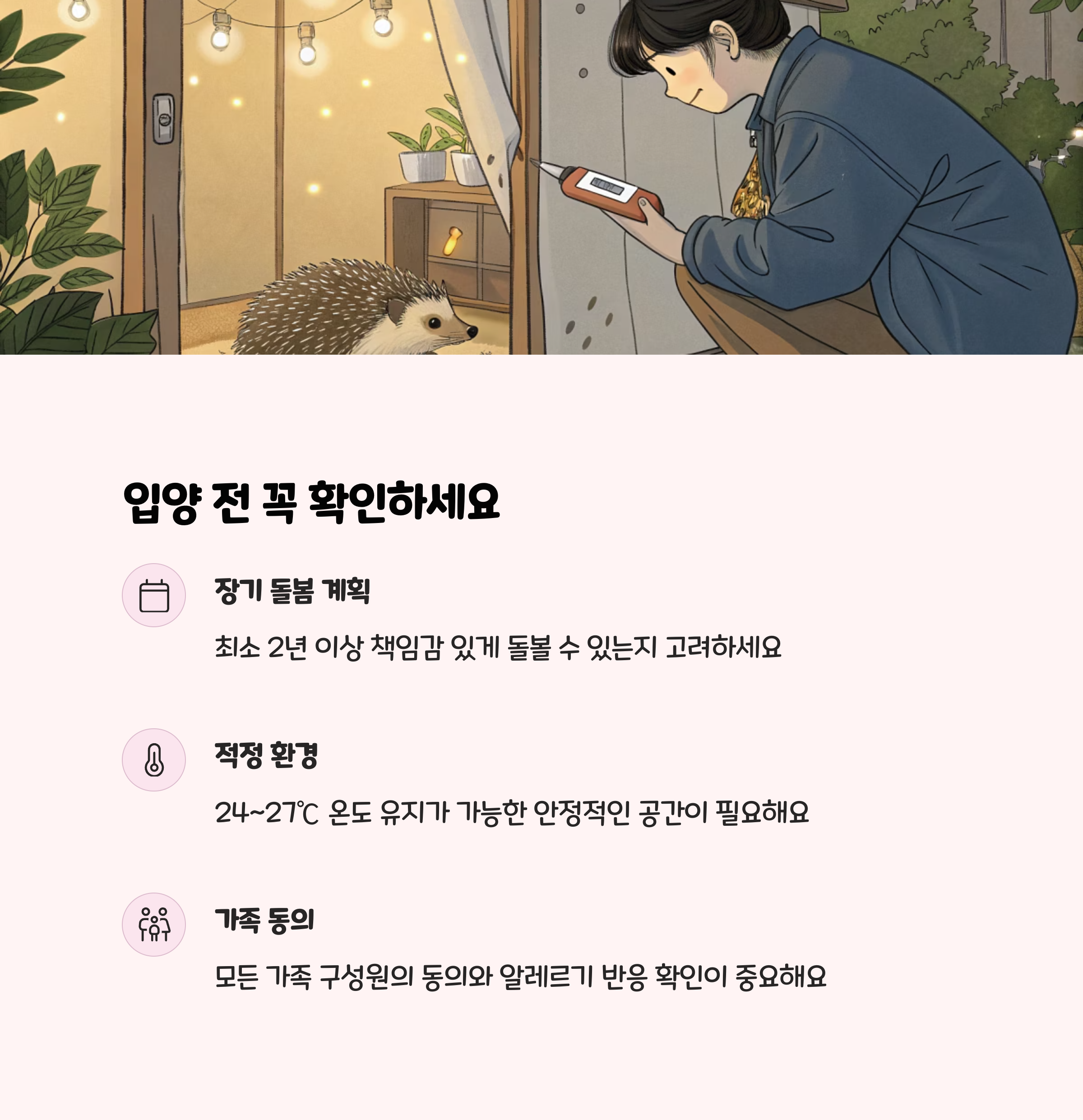 가족의 동의, 돌봄 시간, 사육 환경, 온도 관리, 비용, 소음 등 여러 조건을 충분히 고려해야 합니다. 고슴도치의 특성과 생활 패턴을 이해하고, 장기적으로 책임질 수 있는지 신중히 판단한 후 입양을 결정하세요.