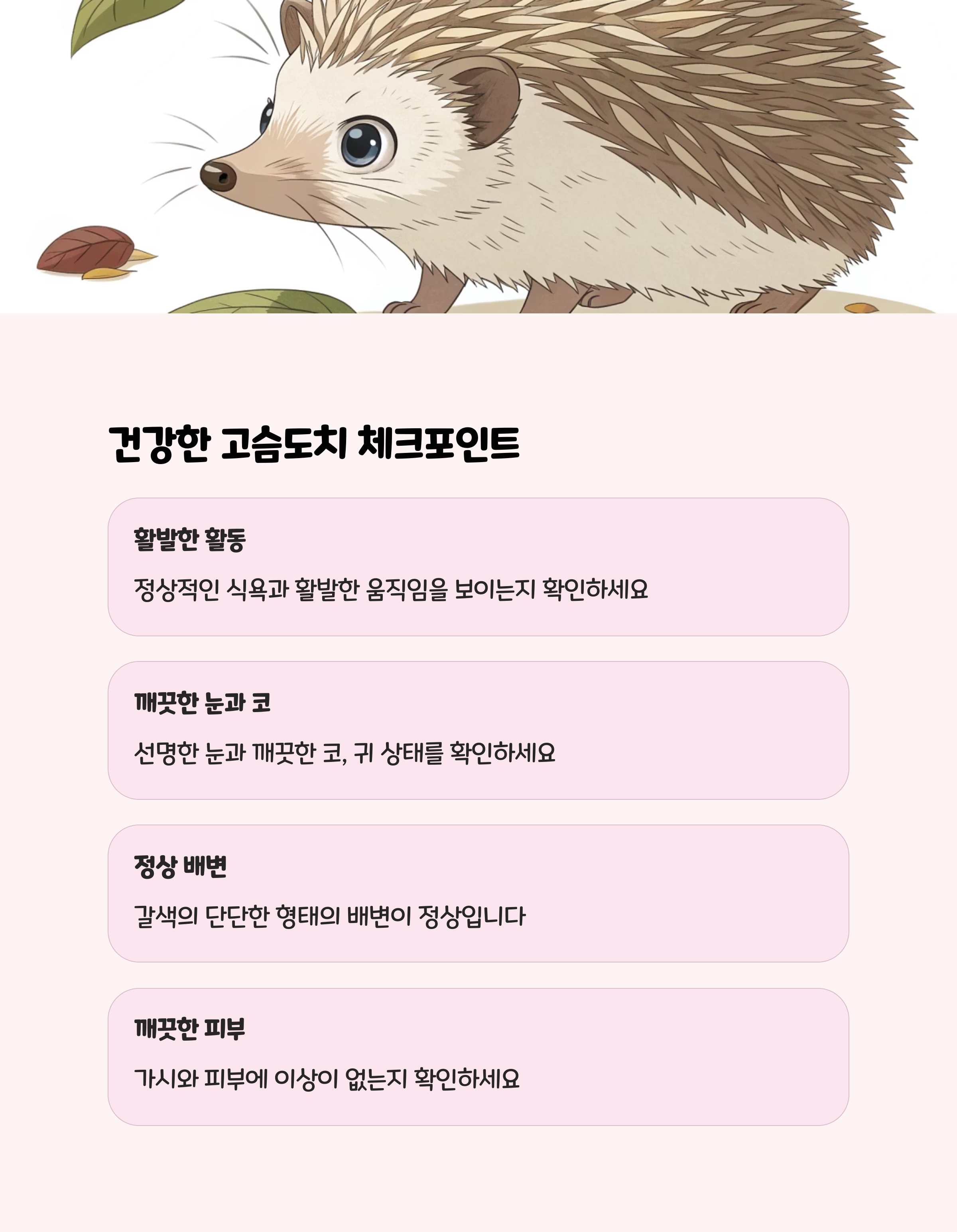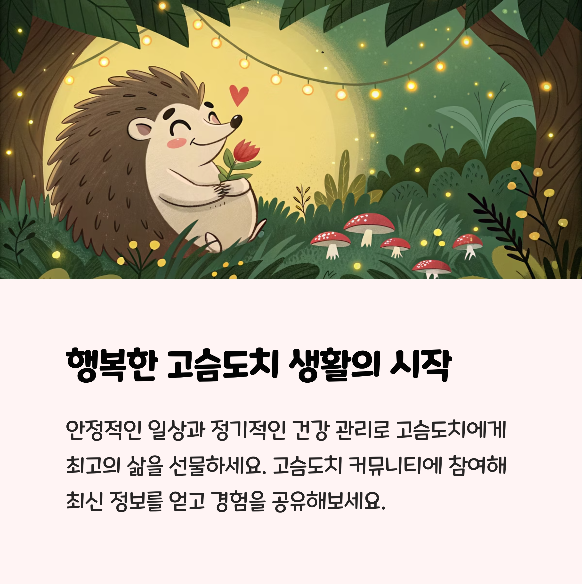 고슴도치는 섬세한 관리와 꾸준한 관심이 필요한 동물입니다. 넓은 공간, 적정 온도, 균형 잡힌 식단, 청결한 환경, 그리고 인내심 있는 교감이 건강하고 행복한 반려 생활의 비결입니다. 고슴도치의 특성을 이해하고, 꼼꼼히 준비한다면 초보자도 충분히 귀엽고 사랑스러운 고슴도치와 오랜 시간을 함께할 수 있습니다. 지금 이 순간, 작은 변화와 세심한 배려로 고슴도치와의 특별한 인연을 시작해 보세요!
