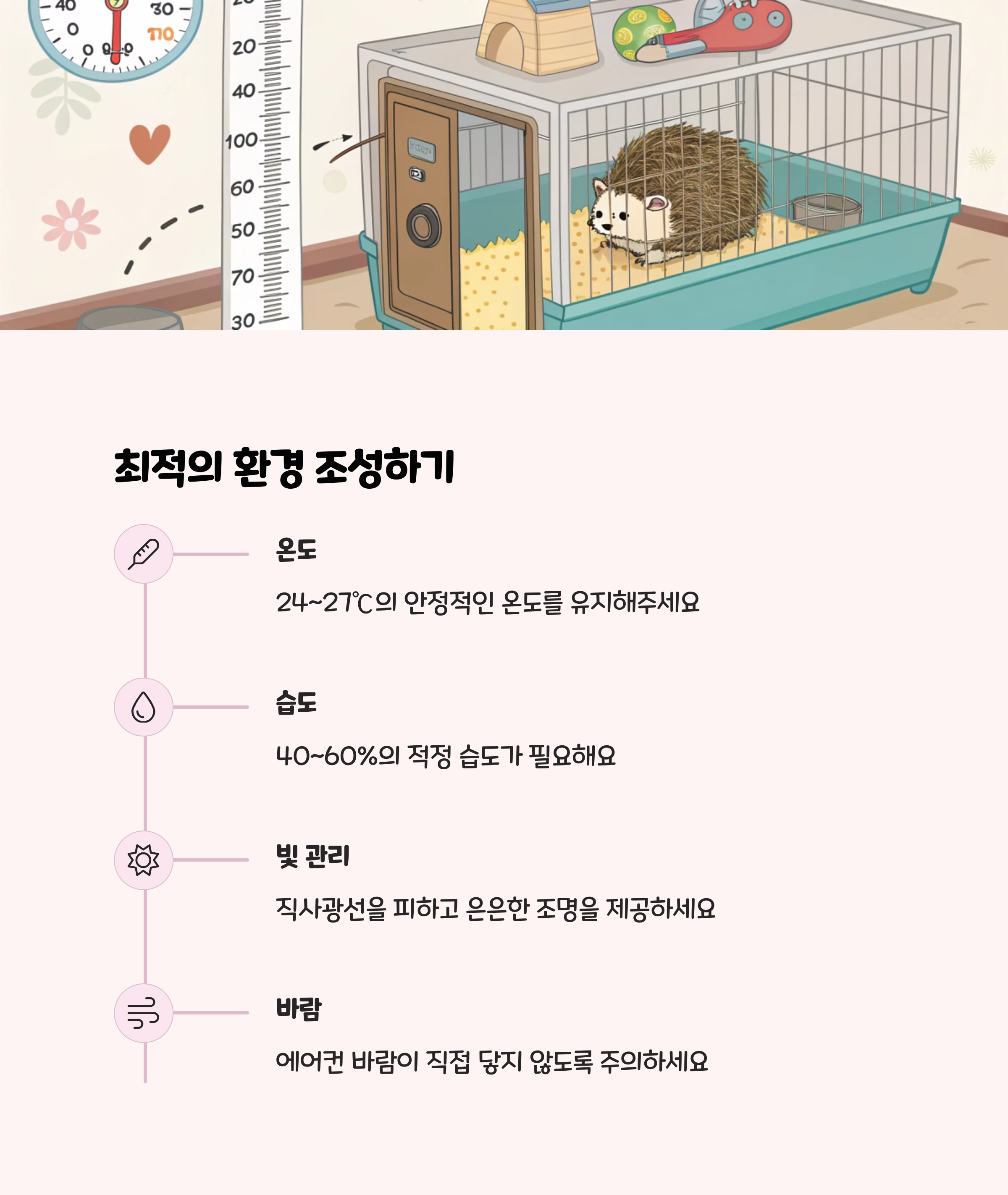 고슴도치는 **22~27℃**의 온도에서 가장 건강하게 지낼 수 있습니다. 겨울철에는 전기방석이나 온도조절 패드를, 여름에는 냉방을 통해 온도를 일정하게 유지하세요. 온도 변화에 민감해 저체온증이나 동면에 빠질 수 있으니 항상 실내 온도를 체크해야 합니다.