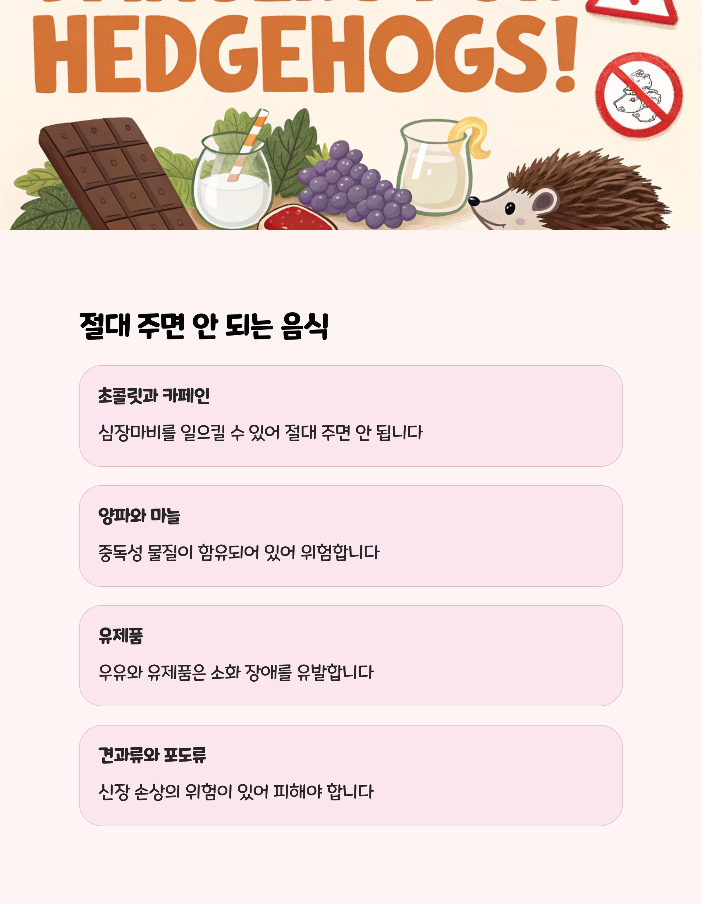 초콜릿, 양파, 마늘, 포도, 아보카도, 우유 및 유제품, 견과류, 사람 음식(조미료, 향신료 첨가)은 고슴도치에게 매우 위험하니 절대 주지 마세요.