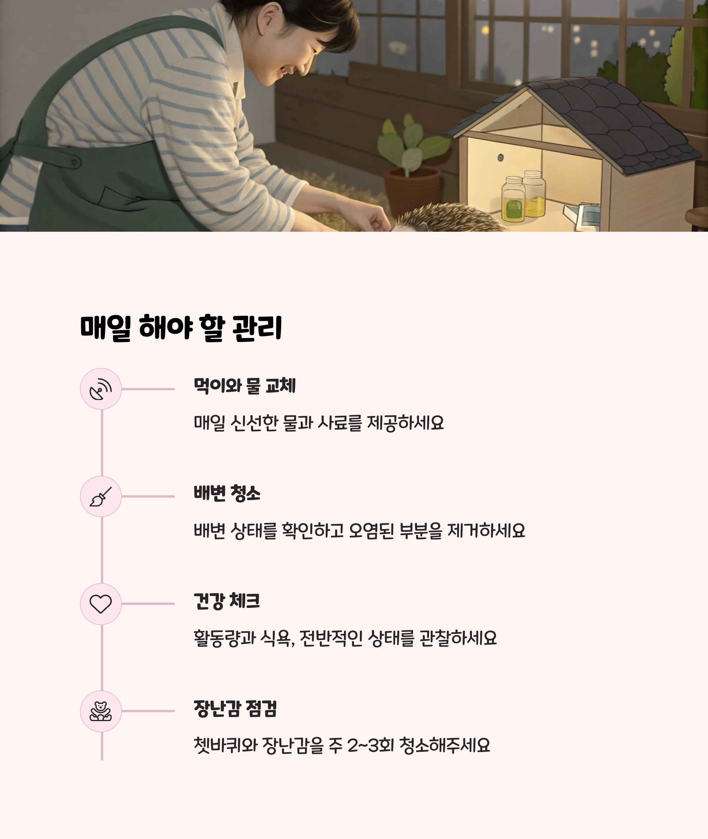 고슴도치는 배변 냄새가 강할 수 있으므로, 케이지와 바닥재, 식기, 화장실은 자주 청소해 주세요. 정기적으로 체중을 측정해 급격한 변화가 없는지 확인하고, 이상 행동(식욕 저하, 무기력 등)이 보이면 즉시 수의사에게 상담하세요.