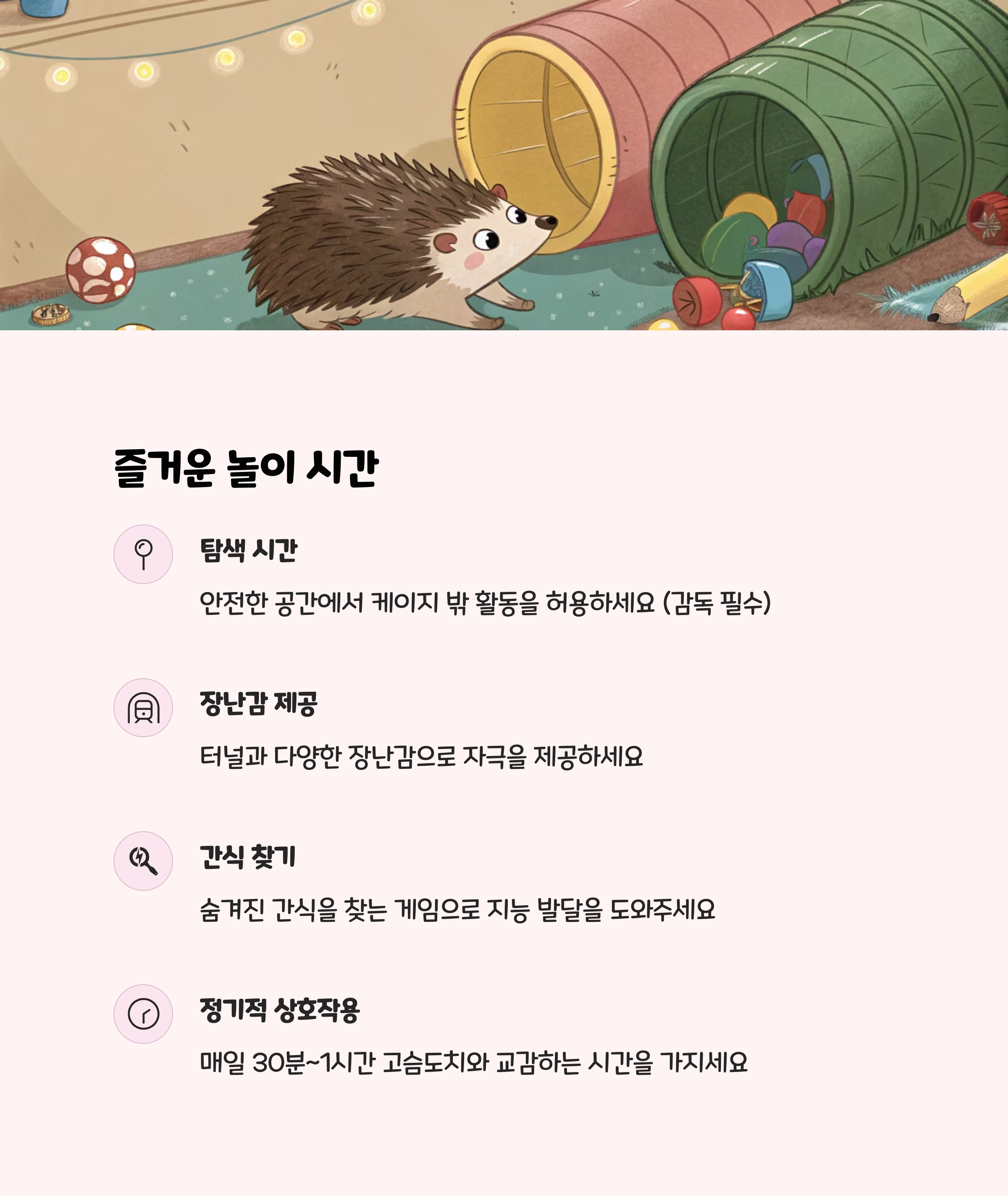 고슴도치는 운동량이 많아 쳇바퀴가 꼭 필요합니다. 발이 빠지지 않는 안전한 디자인을 선택해야 하며, 장난감이나 터널 등 다양한 놀이 도구를 통해 지루함을 해소해 주세요.