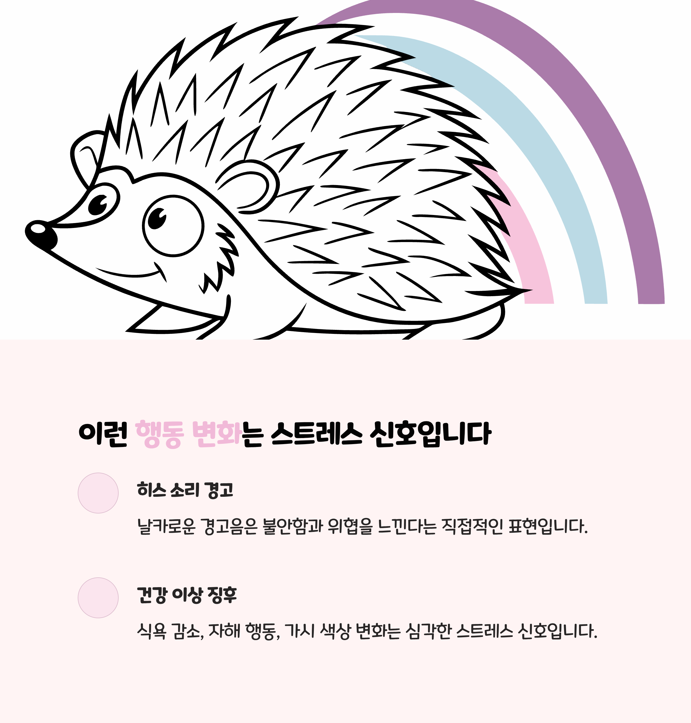 | 스트레스 신호 | 히스 소리, 식욕감소, 자해, 변색 등 | 과도한 자극 피하고 안정된 환경 유지 전문 병원 상담 권장 |