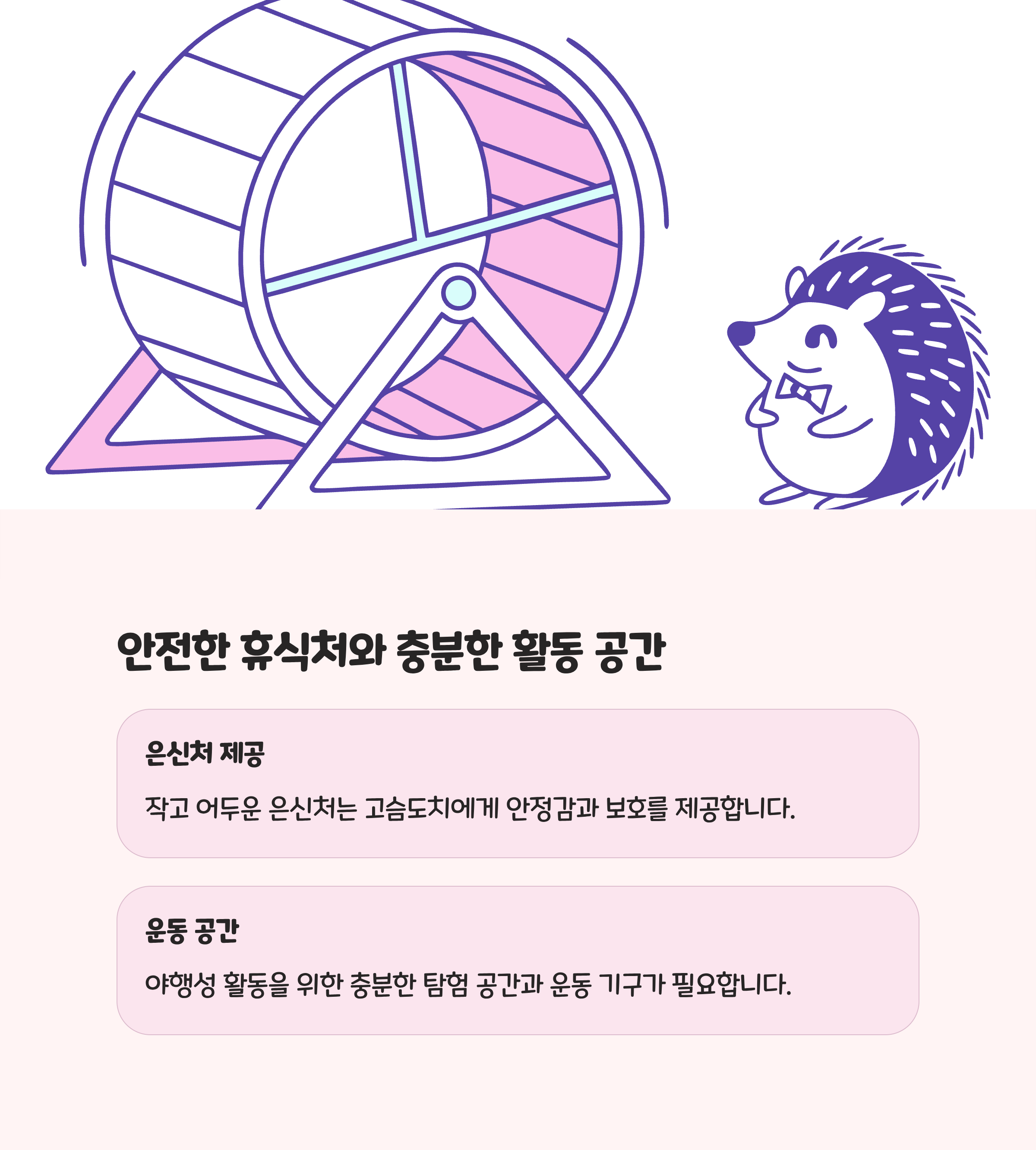 고슴도치는 아프리카가 원산지로, 22~30도 사이의 따뜻한 환경에서 건강하게 지냅니다. 17도 이하에서는 저체온증과 감기에 걸릴 위험이 커져 케이지 온도 조절이 필수입니다. 활동량이 많아 충분한 운동 공간과 쳇바퀴 같은 운동 기구가 필요하며, 독립성을 존중해 은신처를 마련해 주어야 스트레스 감소에 효과적입니다.