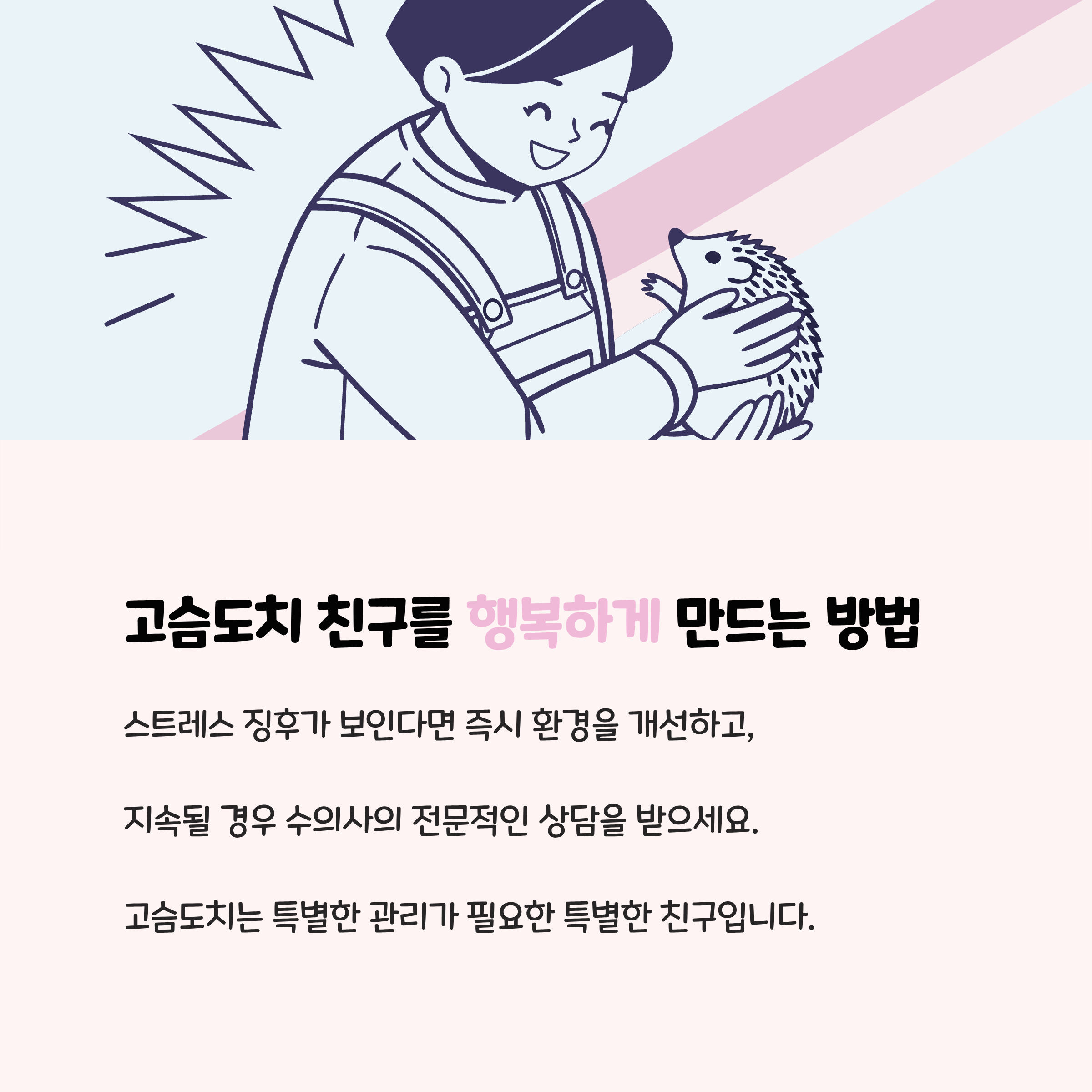 고슴도치는 섬세하고 예민한 동물로, 스트레스 관리와 적절한 환경 제공이 건강과 행복을 좌우합니다. 행동 신호를 세심히 관찰하고 이해한다면, 고슴도치와 더욱 깊은 신뢰 관계를 쌓으면서 즐거운 반려 생활을 할 수 있습니다. 특히 가시에 침을 바르는 ‘안팅’ 행동은 고슴도치 특유의 자연스러운 습성이니 지나치게 걱정하지 않아도 됩니다. 다만 스트레스 신호가 지속될 경우 전문 수의사의 진단을 받는 것이 좋습니다.