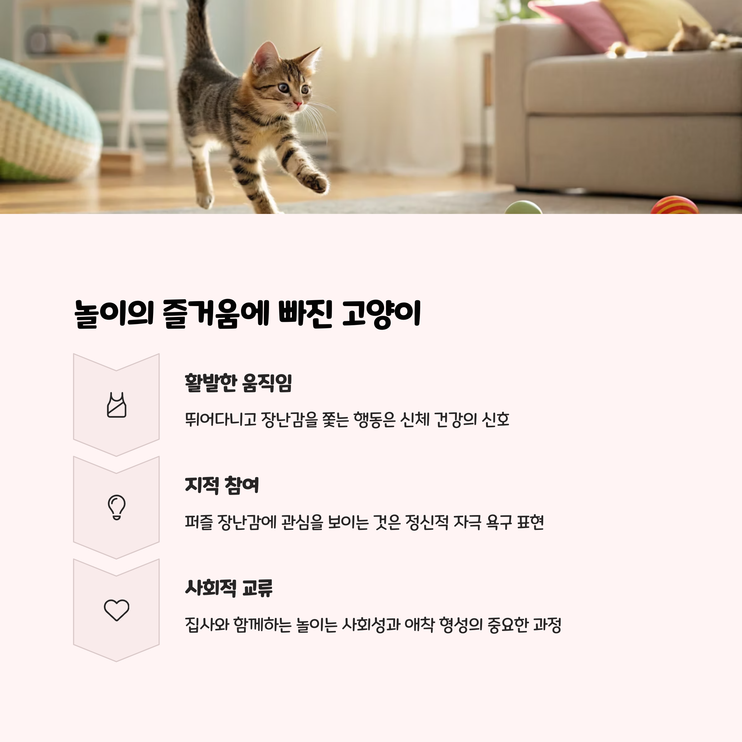 | 충분한 놀이와 상호작용 | 매일 10~20분 이상 사냥놀이, 장난감 놀이로 에너지를 발산시켜 주세요. |